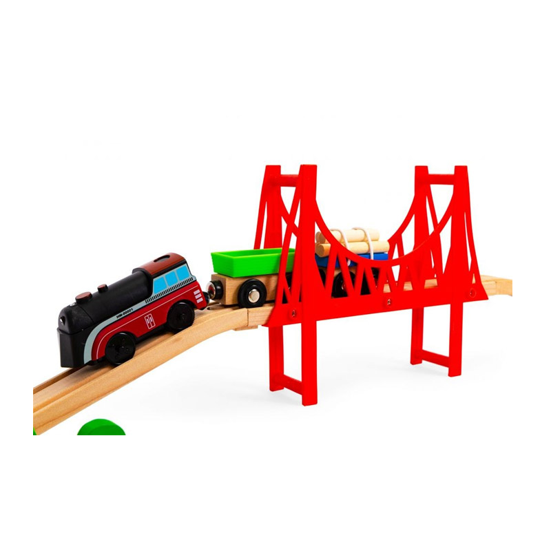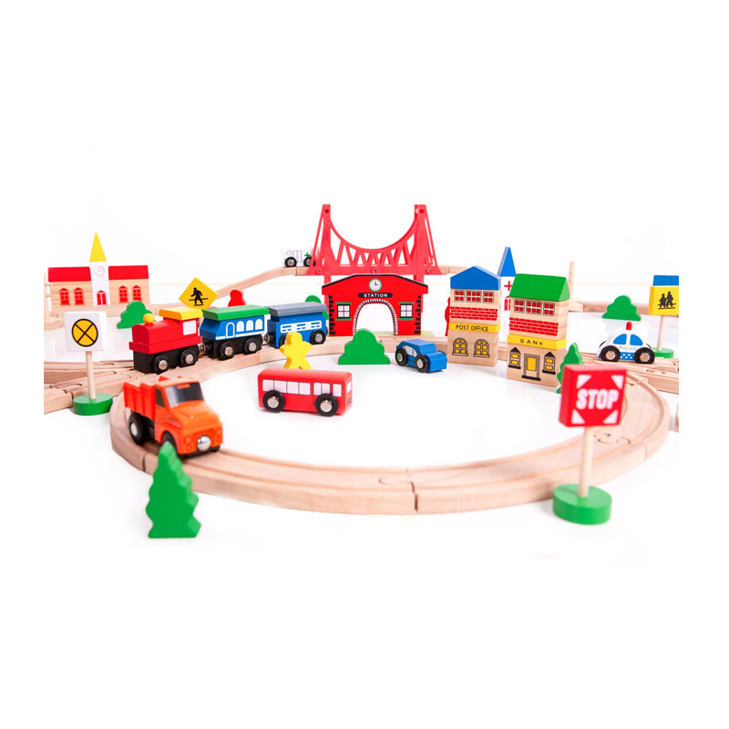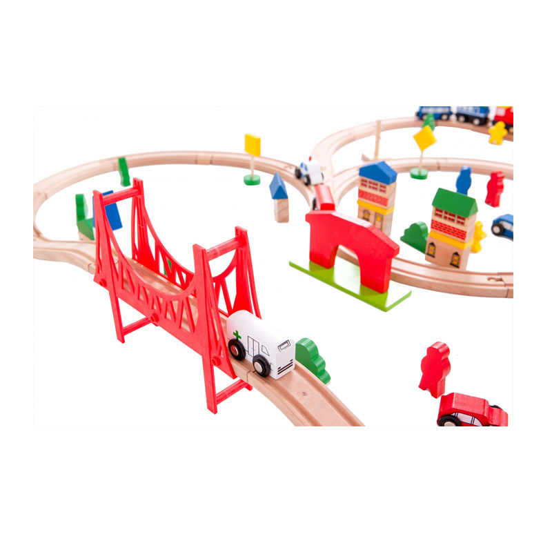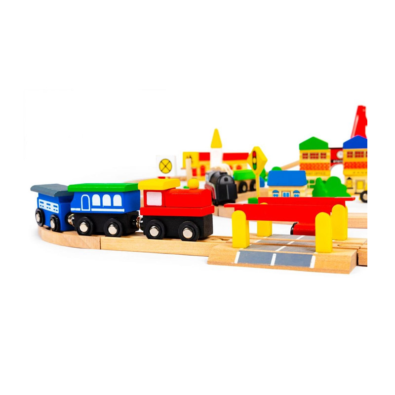 Το σετ, από την εταιρία Ecotoys, αποτελείται από συνολικά 90 στοιχεία, μεταξύ άλλων: ράγες, μικροπαιχνίδια, θάμνους, δέντρα, κτίρια, αυτοκίνητο, οδικές πινακίδες, γερανό κ.λπ. Συνοδεύεται από ηλεκτρική ατμομηχανή, η οποία κινείται με μπαταρία AA (δεν περιλαμβάνεται). Οι ράγες είναι κατασκευασμένες από μασίφ ξύλο και όταν συναρμολογηθούν καλύπτουν έκταση περίπου 107 cm x 93 cm.
