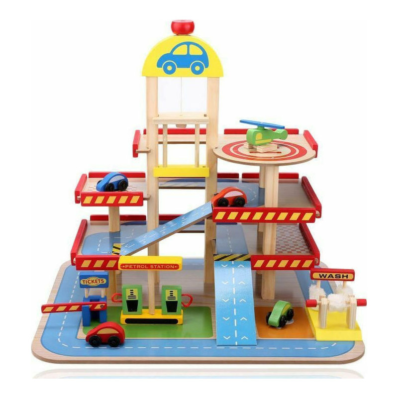 Το παιδικό γκαράζ, από την εταιρία Ecotoys, είναι κατασκευασμένο από ξύλο και διαθέτει 3 επίπεδα. Ο κινούμενος ανελκυστήρας σταματά σε κάθε επίπεδο, χάρη στον οποίο το παιδί σας μπορεί να τραβήξει το αυτοκίνητο στην κορυφή. Η κίνηση του ανελκυστήρα πραγματοποιείται περιστρέφοντας το κόκκινο κουμπί. Έχουν τοποθετηθεί κιγκλιδώματα γύρω από κάθε επίπεδο για να αποτραπεί η ανεξέλεγκτη πτώση του αυτοκινήτου και οι οδηγίες κίνησης έχουν ζωγραφιστεί στις λωρίδες και τις ράμπες εισόδου.