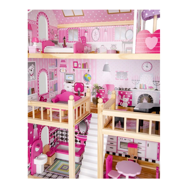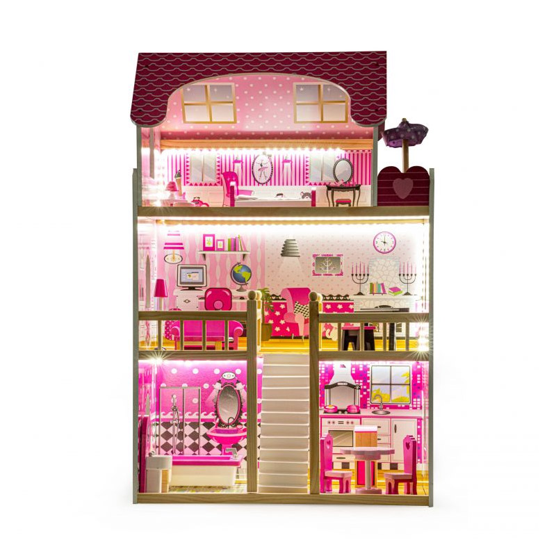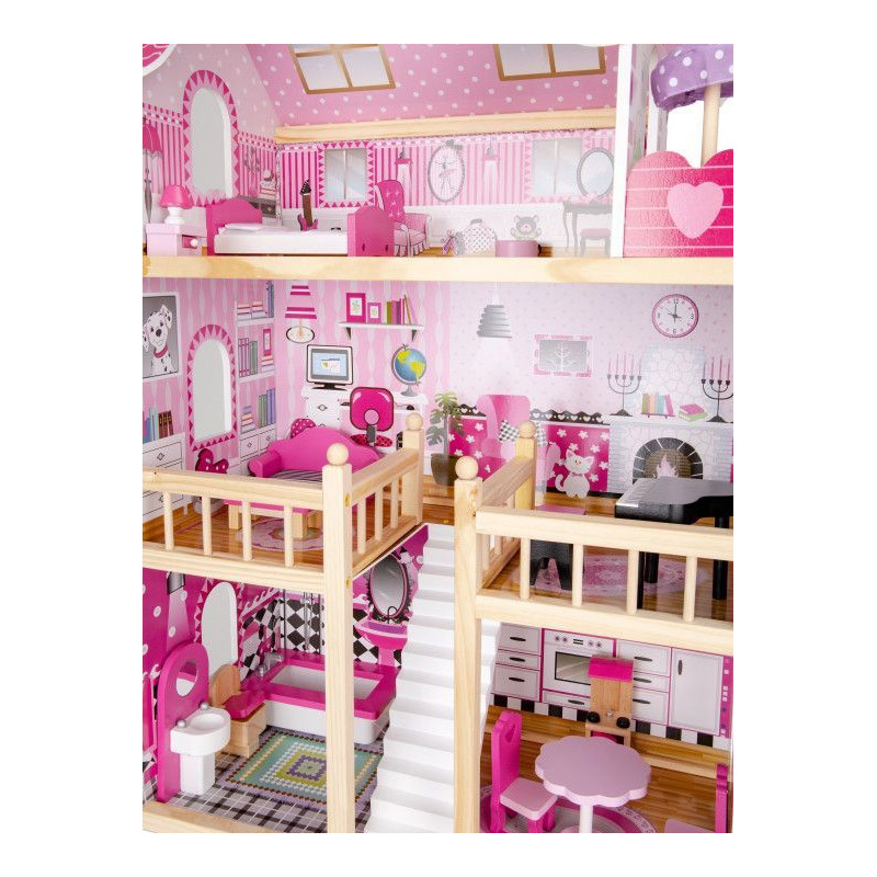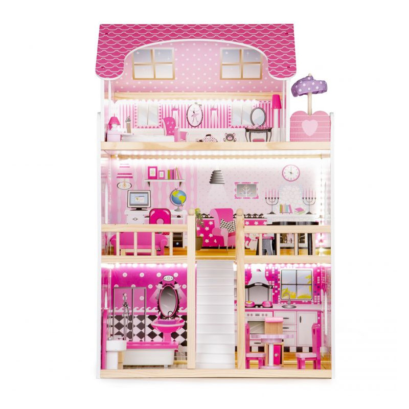 Το κουκλόσπιτο, από την εταιρία Ecotoys, είναι κατασκευασμένο από ξύλο και σανίδα MDF. Όλα τα ξύλινα στοιχεία δεν έχουν αιχμηρές άκρες, καθιστώντας τα 100% ασφαλή για το παιδί. Το σπίτι έχει φωτισμό LED και 3 μεγάλους ορόφους με 5 δωμάτια όπως σαλόνι, κουζίνα, τραπεζαρία, υπνοδωμάτιο και μπάνιο.