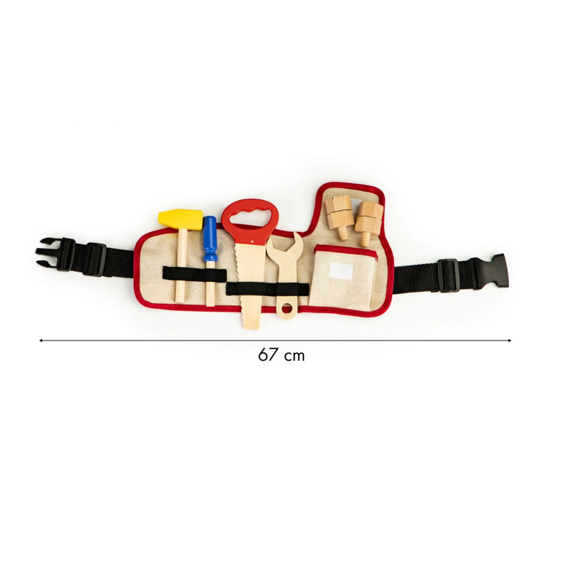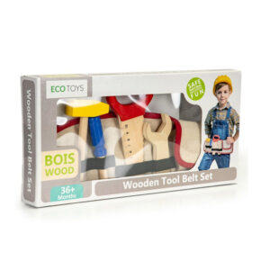 Η παιδική ζώνη, από την εταιρία Ecotoys, περιλαμβάνει 6 ξύλινα εργαλεία, για να παίζουν τα μικρά παιδιά. Είναι 100% ασφαλή για τα παιδιά, καθώς το ξύλο δεν έχει αιχμηρές άκρες και το χρώμα που χρησιμοποιείται είναι χαμηλών εκπομπών, ασφαλές για την υγεία. Τα ξύλινα εργαλεία είναι μια ασφαλής εναλλακτική λύση στα πραγματικά εργαλεία.