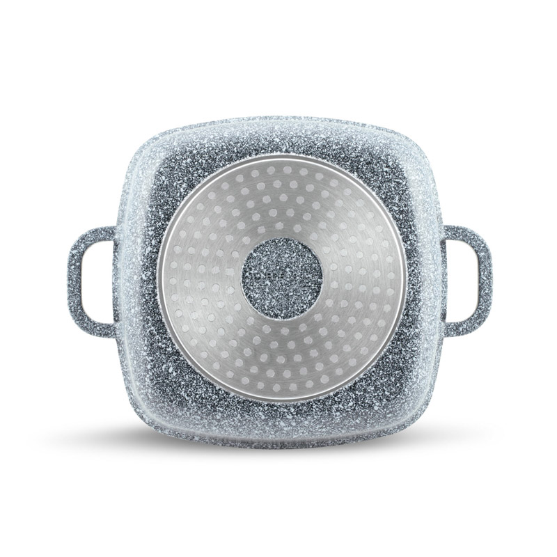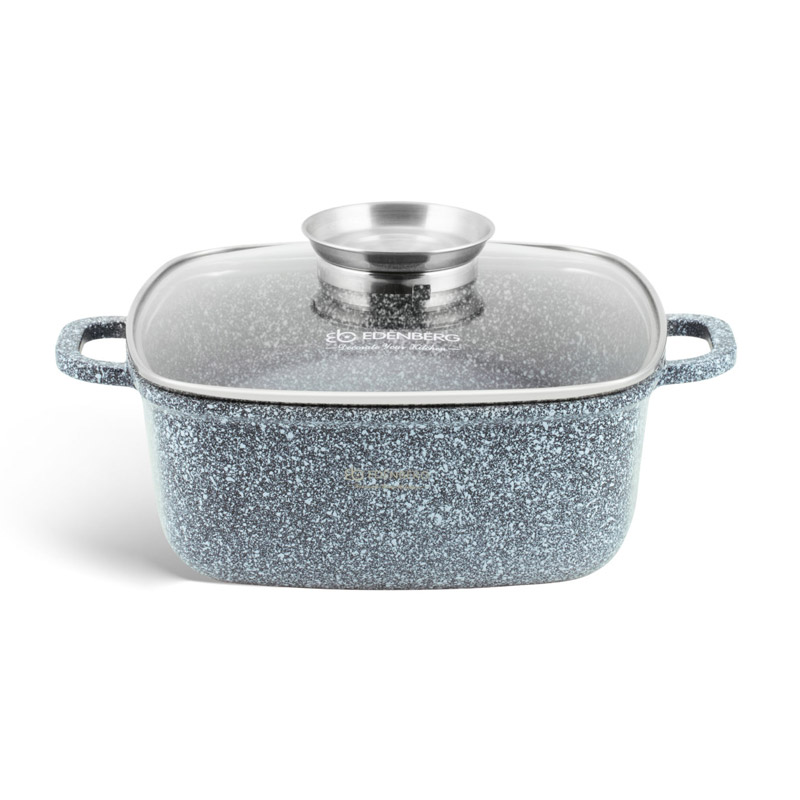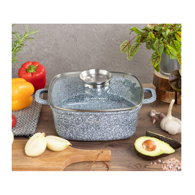 Η τετράγωνη κατσαρόλα, από την εταιρία Edenberg, είναι κατασκευασμένη από συμπιεσμένο αλουμίνιο και διαθέτει κεραμική-γρανίτη αντικολλητική επίστρωση, χωρίς PFOA. Η κατσαρόλα έχει γυάλινο καπάκι με οπή απελευθέρωσης του ατμού, χωρητικότητα 4.4 Lt, είναι κατάλληλη για όλες τις εστίες και πλένεται εύκολα. Η λαβή στο καπάκι διαθέτει ειδική βαλβίδα σταδιακής έκχυσης υγρών, οπότε δε χρειάζεται να ανοίγετε το καπάκι για να προσθέσετε οποιοδήποτε υγρό κατά το μαγείρεμα με αποτέλεσμα να μη χάνετε ενέργεια άσκοπα και μπορείτε να υπολογίζετε με ακρίβεια την ποσότητα του υγρού που πρέπει να προσθέσετε.