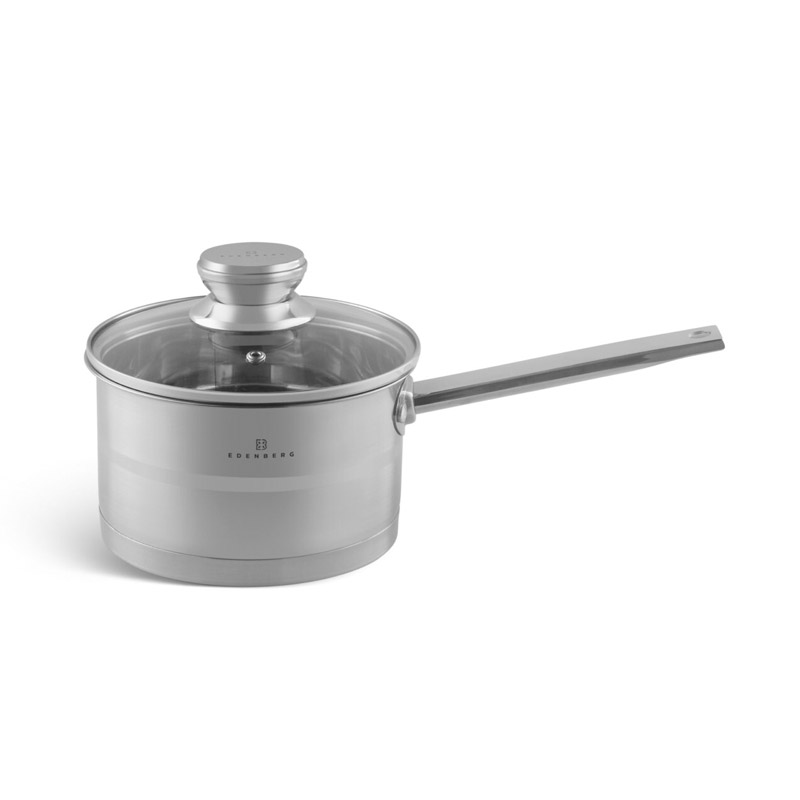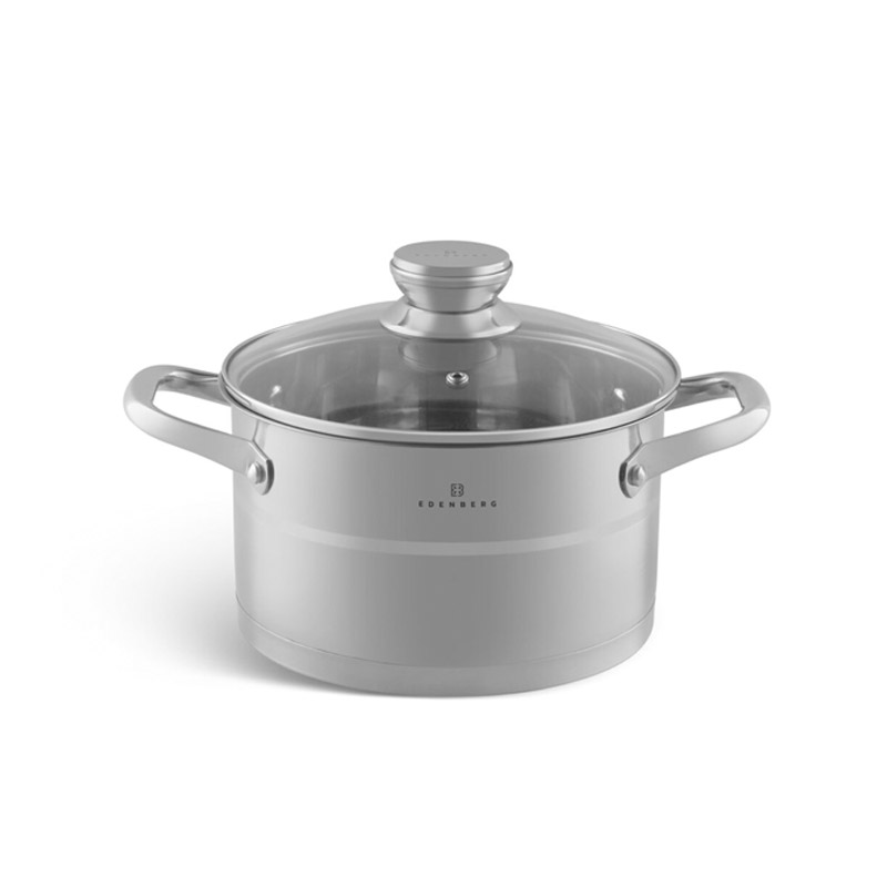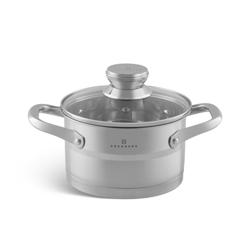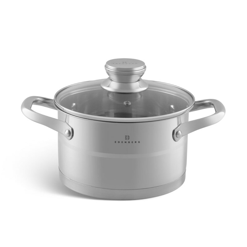 Το σετ, από την εταιρία Edenberg, αποτελείται από μαγειρικά σκεύη κατασκευασμένα από ανοξείδωτο ατσάλι. Διαθέτουν πολυεπίπεδη βάση για ομοιόμορφη κατανομή θερμότητας και είναι εξοπλισμένα με γυάλινα καπάκια με οπή απελευθέρωσης του ατμού. Το τηγάνι του σετ, διαθέτει επίστρωση Teflon.