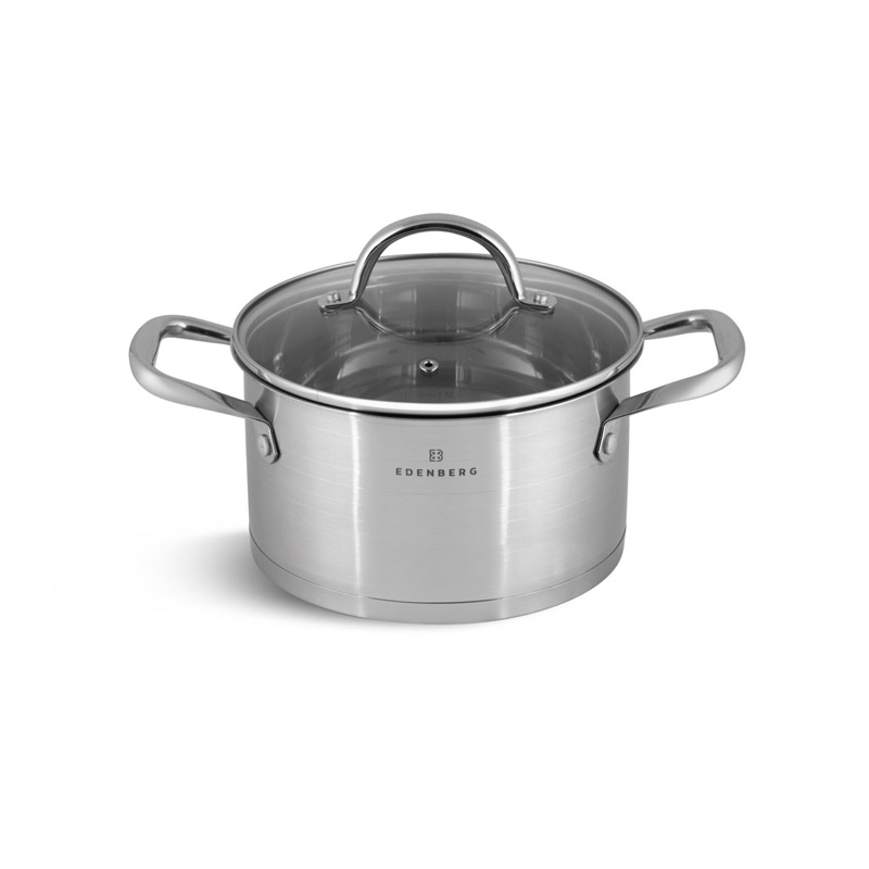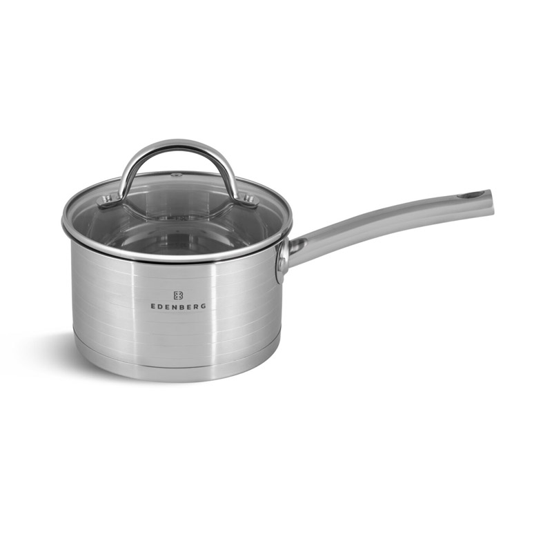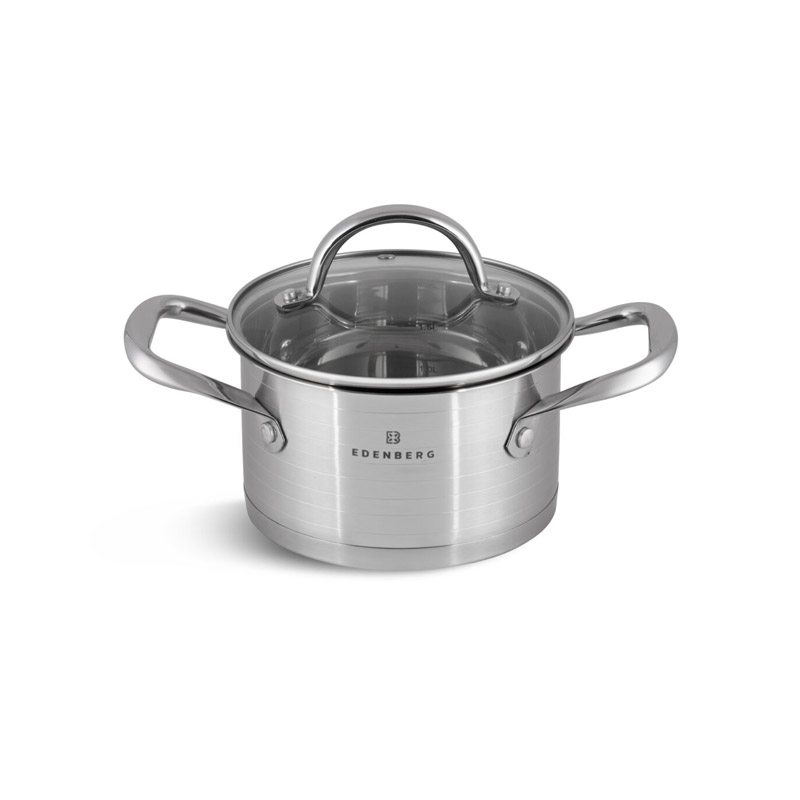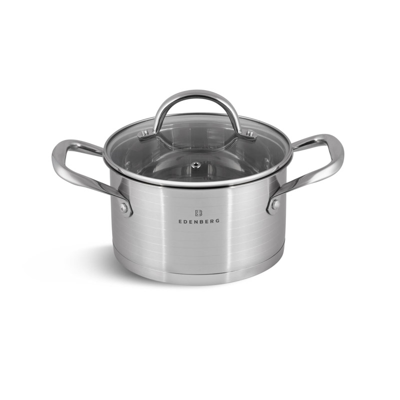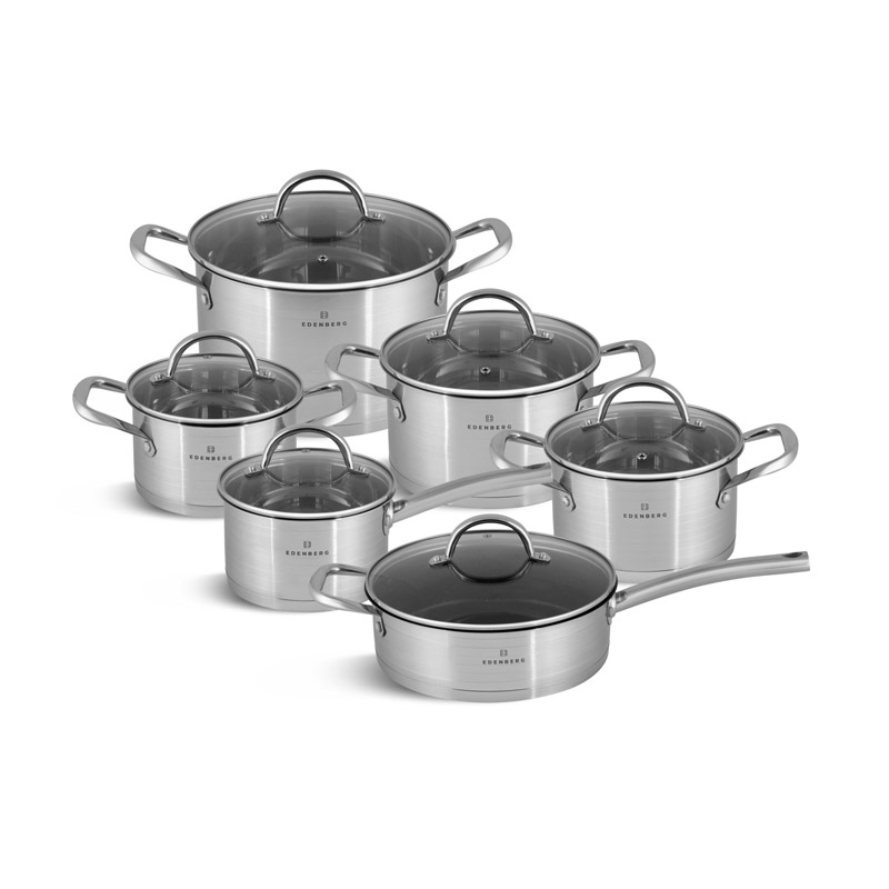 Το σετ, από την εταιρία Edenberg, αποτελείται από μαγειρικά σκεύη κατασκευασμένα από ανοξείδωτο ατσάλι. Διαθέτουν πολυεπίπεδη βάση για ομοιόμορφη κατανομή θερμότητας και είναι εξοπλισμένα με γυάλινα καπάκια με οπή απελευθέρωσης του ατμού.