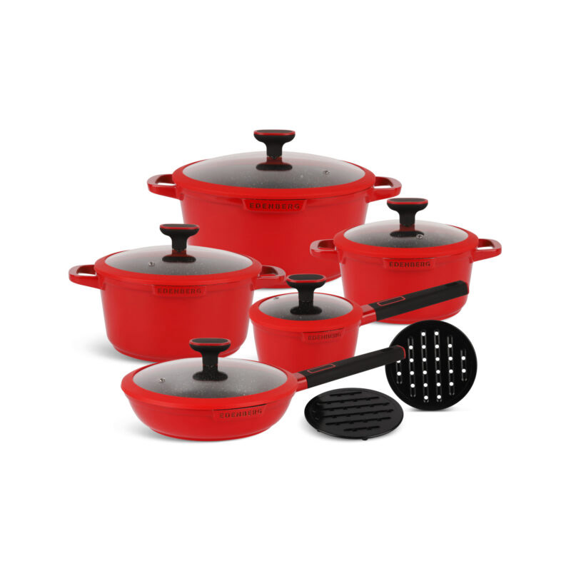 Το σετ, από την εταιρία Edenberg, αποτελείται από μαγειρικά σκεύη κατασκευασμένα από συμπιεσμένο αλουμίνιο, με εσωτερική αντικολλητική κεραμική μαρμάρινη επίστρωση, χωρίς PFOA. Ο ελαφρύς σχεδιασμός παρέχει εξαιρετική αγωγιμότητα θερμότητα και είναι ανθεκτικά στις γρατζουνιές και τις υψηλές θερμοκρασίες.