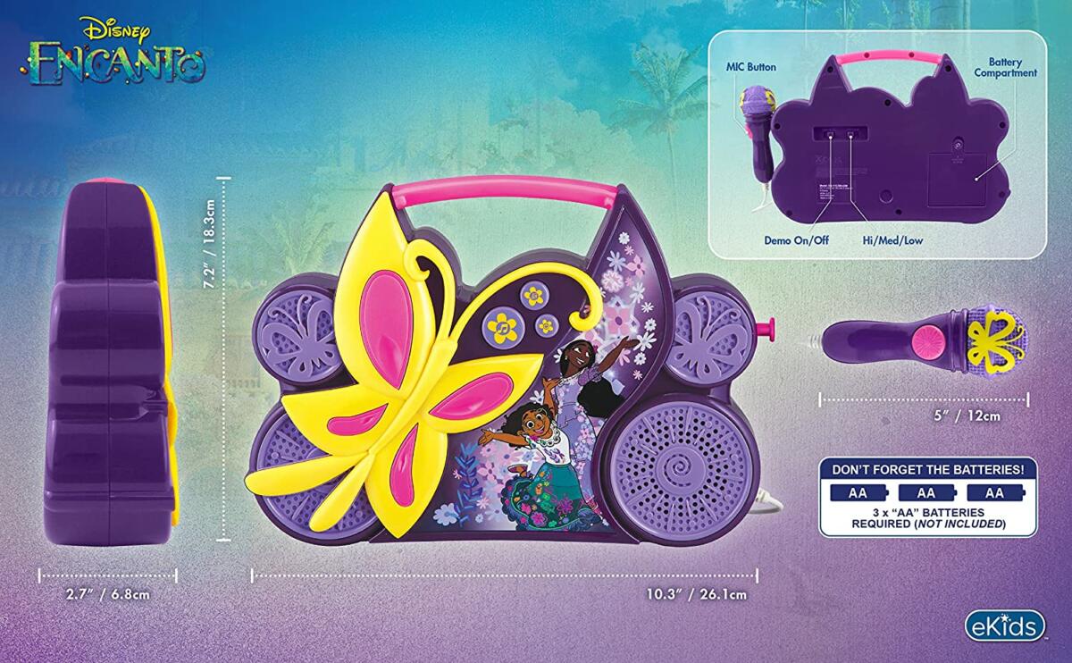 eKids Encanto Boombox Karaoke & Ενσύρματο Μικρόφωνο για παιδιά με ενσωματωμένη μουσική, φωτισμό, Sound Effects (EN-115) (Κίτρινο/Μωβ/Ροζ)