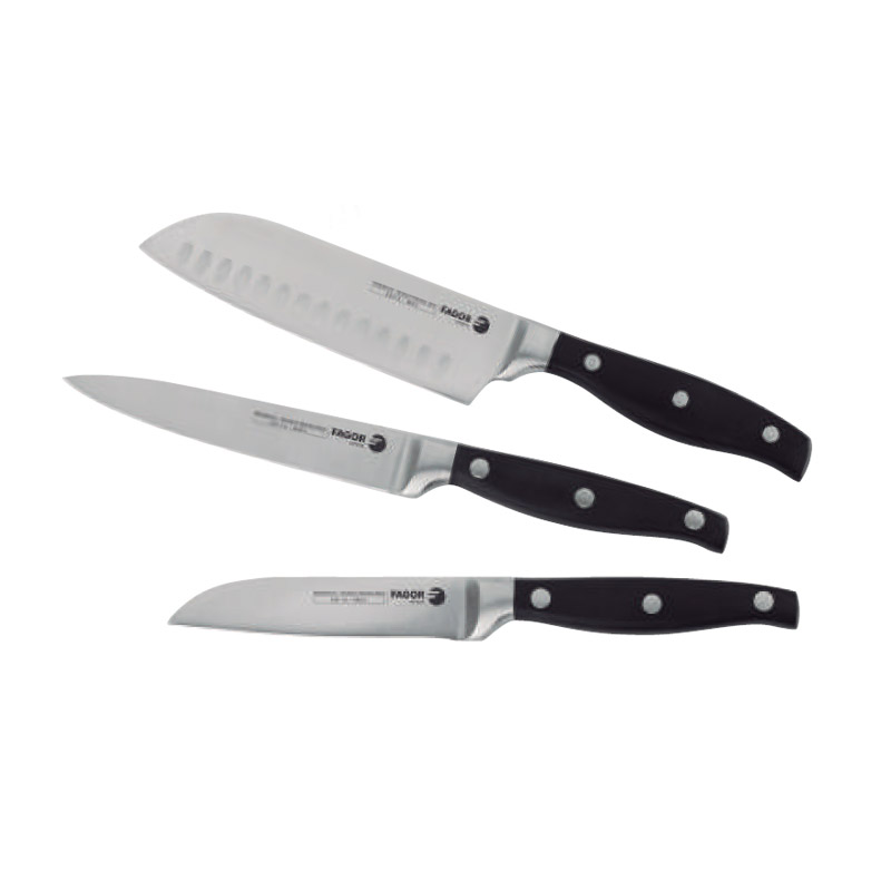 Το σετ, από την εταιρία Fagor, αποτελείται από 3 μαχαίρια κατασκευασμένα από ανοξείδωτο ατσάλι με εργονομικές λαβές. Πιο συγκεκριμένα, περιλαμβάνει ένα μαχαίρι Santoku 18 cm, ένα μαχαίρι γενικής χρήσης 12.5 cm και ένα μαχαίρι ξεφλουδίσματος 9 cm.