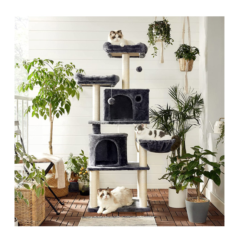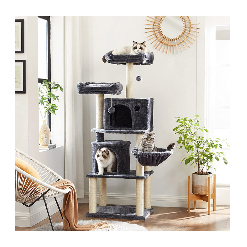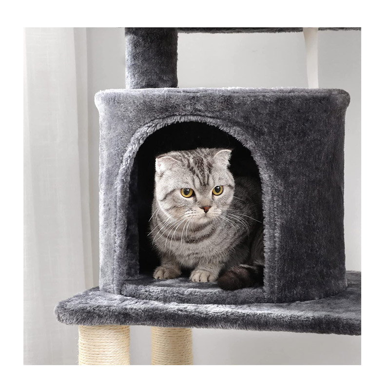 Το δέντρο, στηρίζεται από σωλήνες κατασκευασμένοι από συμπιεσμένο χαρτόνι υψηλής πυκνότητας, οι οποίοι μπορούν να συγκρατήσουν τις πλατφόρμες σταθερές και χωρίς ταλάντωση. Το φυσικό σχοινί σιζάλ είναι πολύ ανθεκτικό αλλά αρκετά ισχυρό για να αντέχει σε συνεχείς γρατζουνιές, ικανοποιώντας τα ένστικτα της γάτας σας. Διαθέτει 2 σπιτάκια, 4 πλατφόρμες και 2 κρεμαστές μπάλες για παιχνίδι.