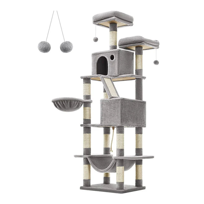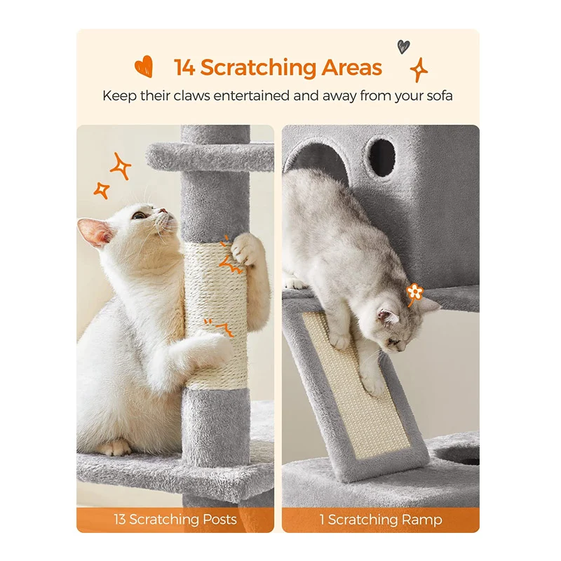 Το δέντρο γάτας, έχει δύο σπιτάκια, ένα χνουδωτό καλάθι, δύο pom poms με κουδουνάκι, μία αιώρα και δύο χνουδωτές κούρνιες. Επίσης, με τις περιοχές γρατσουνίσματος σε κάθε επίπεδο, οι γάτες σας μπορούν να γρατσουνίσουν με άνεση, χωρίς να φθείρουν τα έπιπλά σας. Επιπλέον, η ράμπα γρατσουνίσματος λειτουργεί ως σκάλα για να βοηθήσει τα γατάκια και τις ηλικιωμένες γάτες να ανεβαίνουν εύκολα.