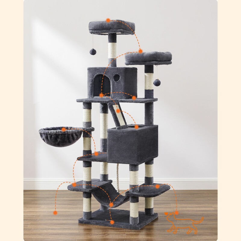 Με 2 καλά επενδεδυμένες πλατφόρμες καθίσματος, 2 άνετες φωλιές γάτας, 1 αφράτο καλάθι, 2 πομ-πομ και 1 αιώρα με 1 σχοινί παιχνιδιού από πάνω, οι μικρές σας γούνινες μύτες θα βρουν πάντα άνεση και διασκέδαση σε αυτό το πολυώροφο δέντρο γάτας.