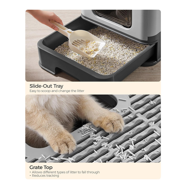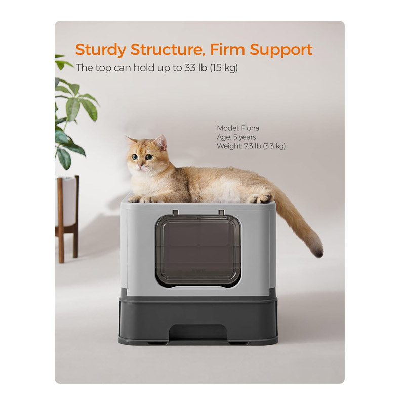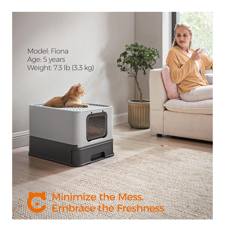 Η κλειστή τουαλέτα γάτας, από την εταιρία Feandrea, παρέχει στη γάτα σας ιδιωτικότητα. Η πόρτα μπορεί να ρυθμιστεί έτσι ώστε να ανοίγει μόνο από τη μία πλευρά και το επάνω άνοιγμα να μπορεί να χρησιμοποιηθεί ως έξοδος. Η πόρτα μπορεί επίσης να ανοίξει και από τις δύο πλευρές – ανάλογα με τις ανάγκες σας. Εάν η γάτα σας είναι αρχάρια, μπορείτε επίσης να αφαιρέσετε την πόρτα.