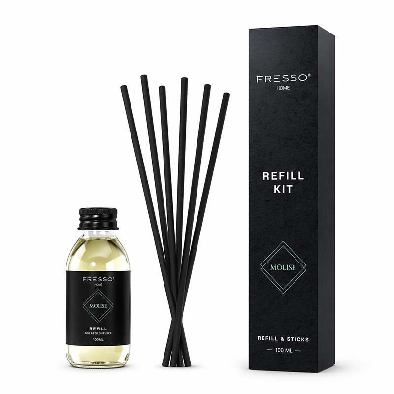 Fresso – Κιτ Αναπλήρωσης με Άρωμα Molise 100 ml Premium Home Refill Kit και 6 Μαύρα Στικ από Fiberglass για Αρωματικό Χώρου Reed Diffuser – 1 Τεμ. (390044/FRE) 5905979390044