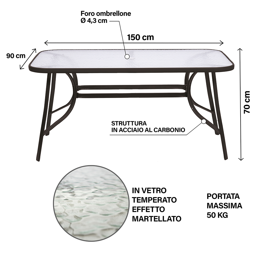 - Επιφάνεια από γυαλί ασφαλείας με τρύπα για ομπρέλα για ακόμα περισσότερη άνεση.