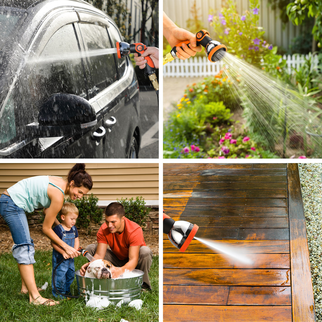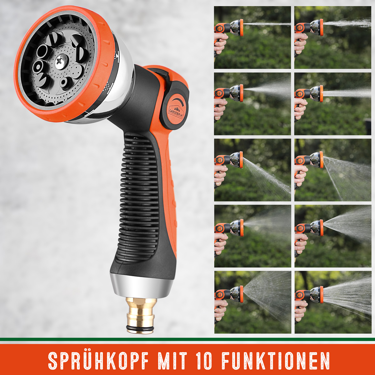 Η κεφαλή ψεκασμού έχει 10 λειτουργίες: 8 ρυθμιζόμενες λειτουργίες ψεκασμού, καθώς και ρύθμιση πίεσης και πρακτική λειτουργία κλειδώματος για το κουμπί ψεκασμού, σημαντική για το απαλό πότισμα ευαίσθητων φυτών. Η βελτιστοποιημένη λαβή του εύκαμπτου σωλήνα, με την αντιολισθητική επικάλυψη, εξασφαλίζει τέλειο κράτημα. Η υψηλής ποιότητας βαμμένη βάση τοίχου έχει επένδυση από καουτσούκ για επιπλέον προστασία του υλικού.