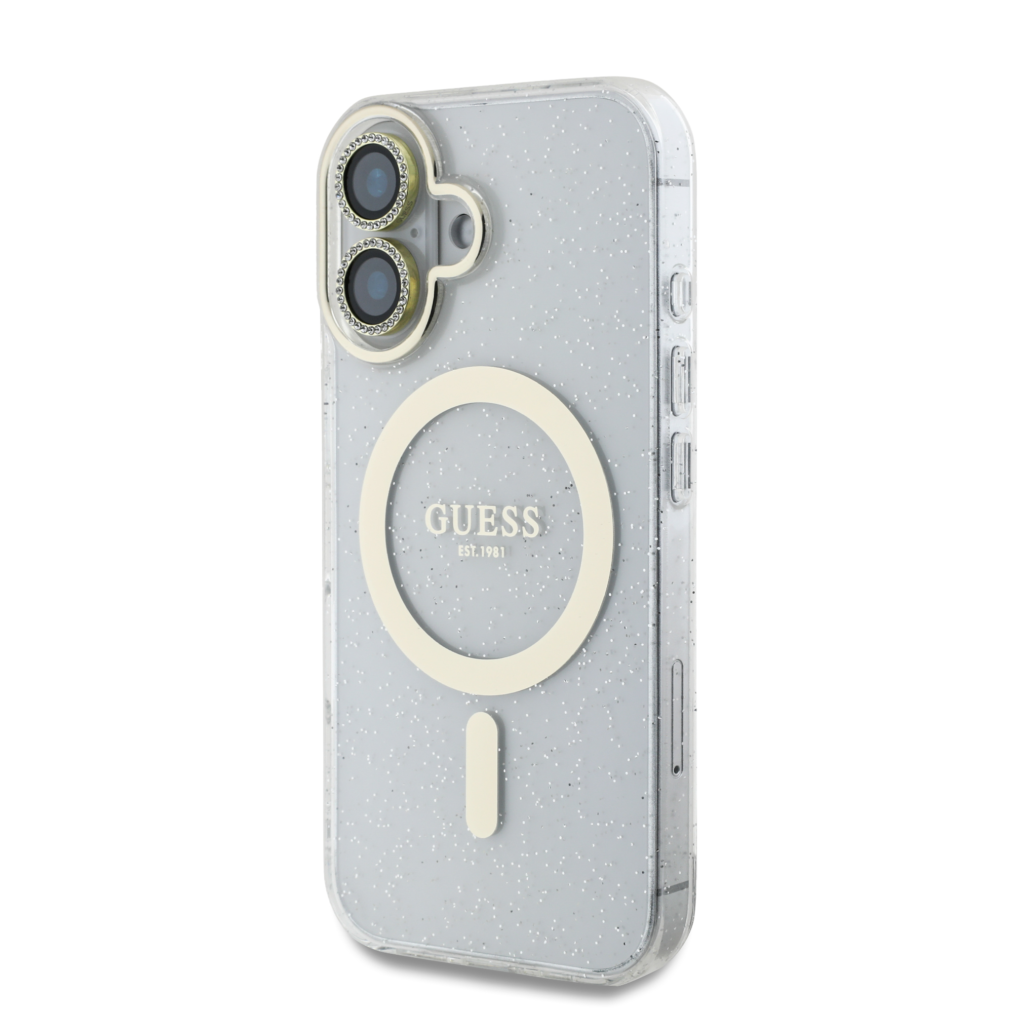 Guess IML Magsafe Case “Rhinestone Gold Lens + Screen” Θήκη προστασίας από σκληρό πλαστικό – iPhone 16 (Clear/Glitter – GUOBPLTP16SHCMCGT)