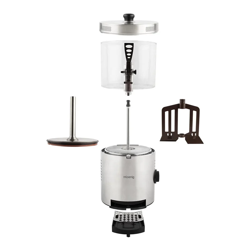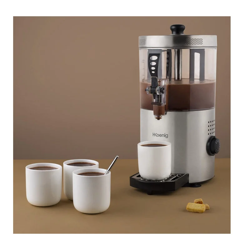 Η σοκολατιέρα, από την εταιρία H.Koenig, είναι ιδανική για την προετοιμασία και το σερβίρισμα νόστιμης και ζεστής σοκολάτας. Διαθέτει μεγάλη δεξαμενή 3 Lt και σχεδιασμό από ανοξείδωτο ατσάλι. Χάρη στον ρυθμιζόμενο θερμοστάτη και την περιστρεφόμενη λεπίδα, προετοιμάζει αυτόματα το ρόφημα και το διατηρεί ζεστό σε βέλτιστη θερμοκρασία μεταξύ 90 και 120 °C. Βοηθήστε τον εαυτό σας απλά ανοίγοντας τη βρύση χωρίς σταγόνες και τραβώντας προς τα έξω τον ενσωματωμένο δίσκο σταγόνων της.