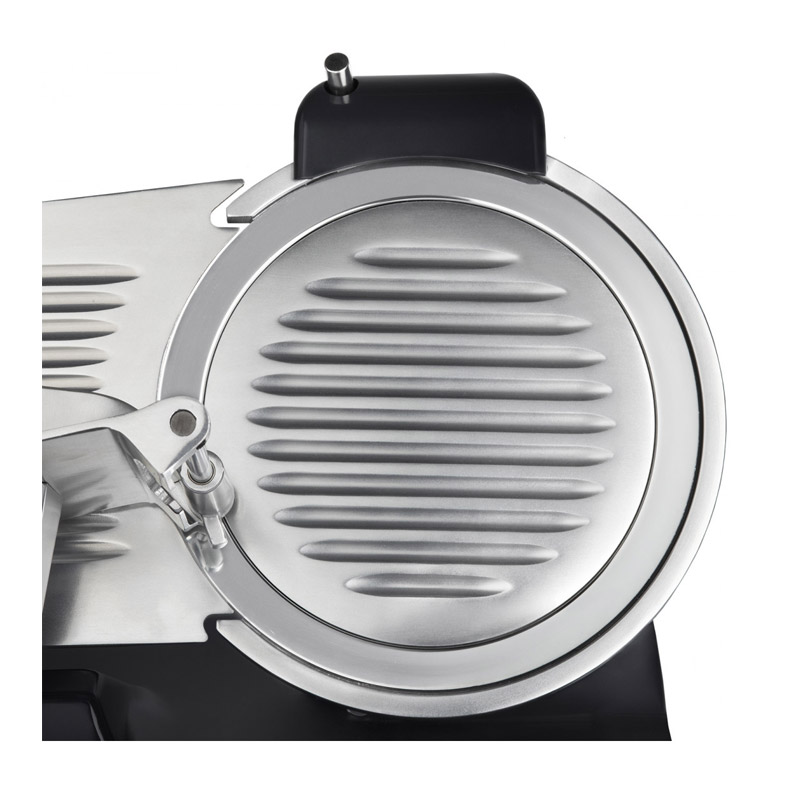 Η μηχανή κοπής, έχει ενσωματωμένο ακονιστήρι λεπίδας για βέλτιστο αποτέλεσμα κοπής και φαρδιά πλάκα που διευκολύνει την τοποθέτηση ενός μεγάλου ζαμπόν. Τα 4 αντιολισθητικά πόδια, εξαλείφουν τον κίνδυνο πτώσης ή αστάθειας.