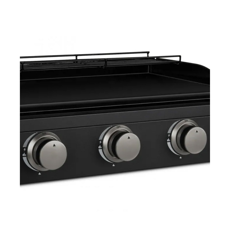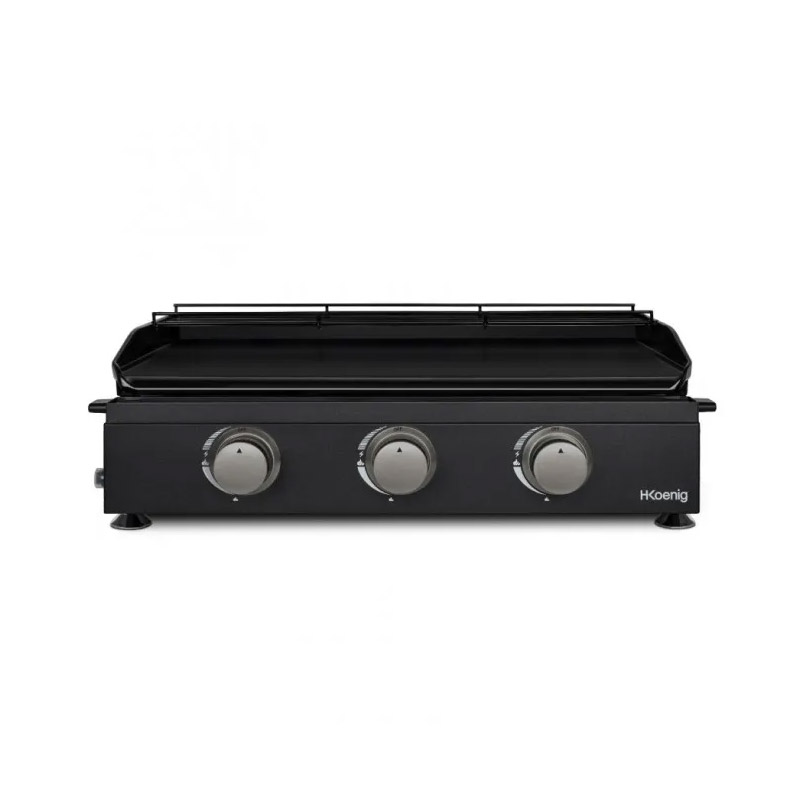 Η ψησταριά, από την εταιρία H.Koenig, λειτουργεί με προπάνιο ή βουτάνιο και είναι άμεσα εμπνευσμένη από επαγγελματικές κουζίνες. Εξοπλισμένη με εμαγιέ πλάκα από χυτοσίδηρο, μπορεί να φτάσει σε θερμοκρασία έως 350 °C. Οι 3 καυστήρες σχήματος U από ανοξείδωτο ατσάλι εγγυώνται ομοιογενή κατανομή θερμότητας σε ολόκληρη την επιφάνεια, για τέλειο ψήσιμο των τροφίμων. Η επιφάνεια μαγειρέματος 63.5 x 36 cm, σας επιτρέπει να μαγειρέψετε γεύμα για έως 8 άτομα.