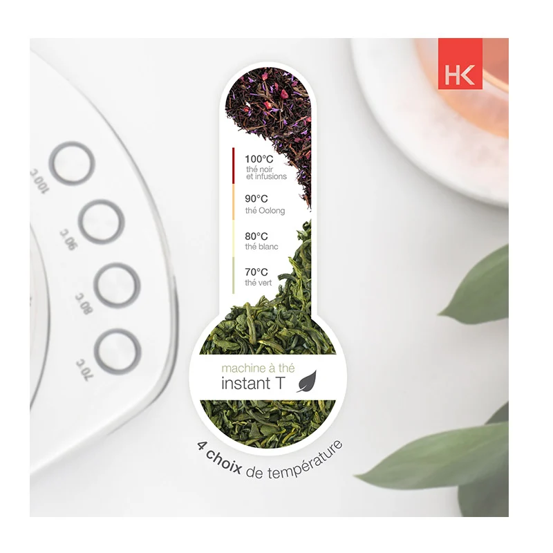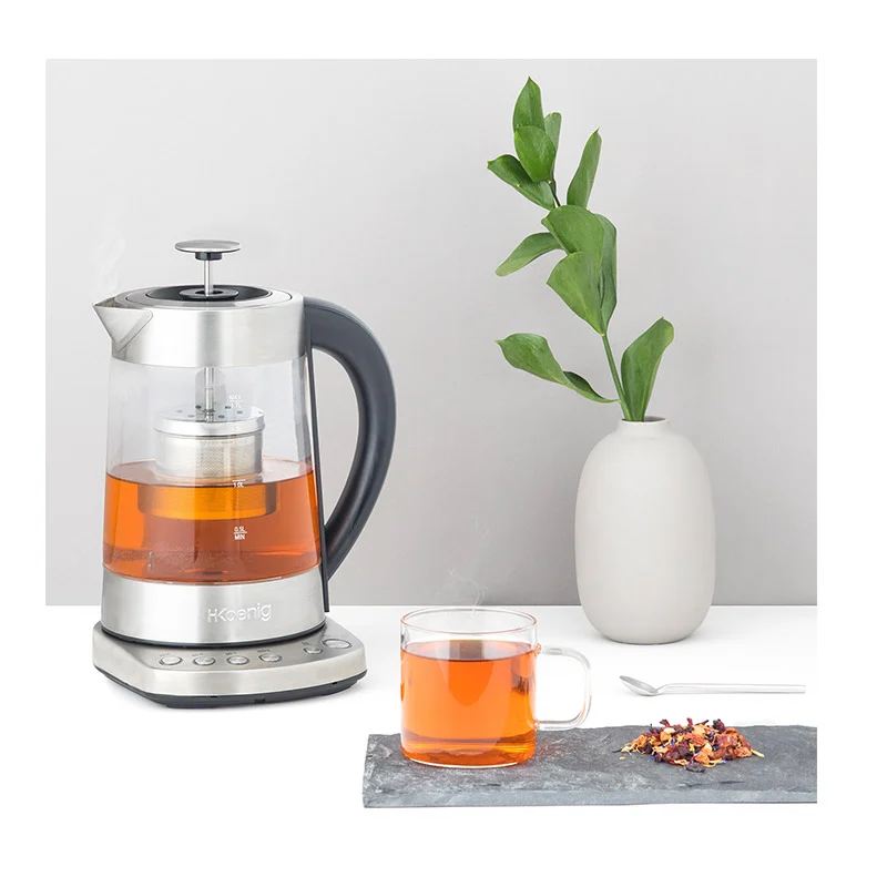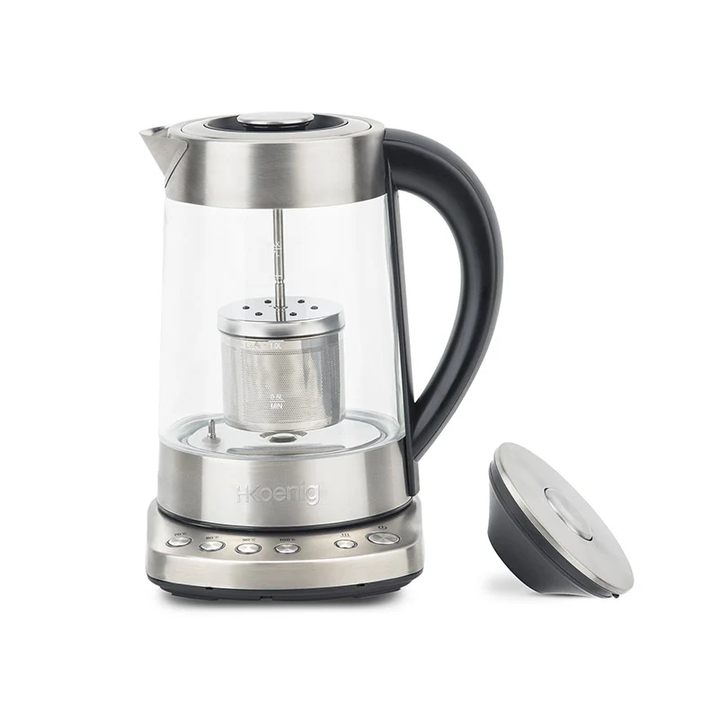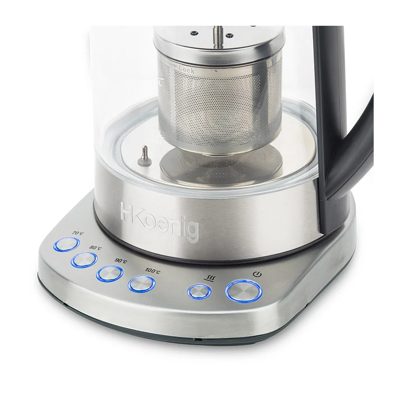 Ο βραστήρας, από την εταιρία H.Koenig, διαθέτει σώμα από ανοξείδωτο ατσάλι, φίλτρο τσαγιού από ανοξείδωτο ατσάλι και γυάλινη κανάτα 1.7 Lt. Έχει 4 επιλογές θερμοκρασίας, 70 °, 80 °, 90 ° και 100 °C και παράλληλα η αύξηση της θερμοκρασίας είναι γρήγορη χάρη στην ισχύ των 2400 W. Ο βραστήρας διατηρεί το τσάι σας ζεστό για 30 λεπτά, ιδανικό για να παρατείνει τη γεύση σας.