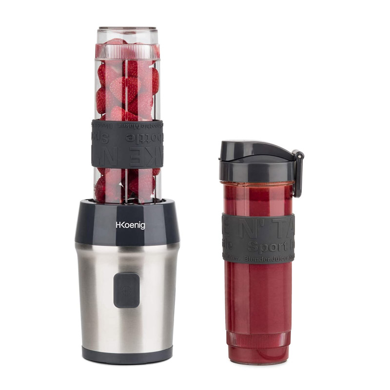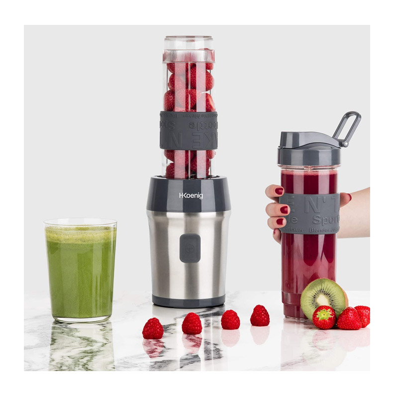 Το μπλέντερ, από την εταιρία H.Koenig, σας δίνει τη δυνατότητα να φτιάξετε λαχταριστά smoothies γρήγορα και εύκολα. Διαθέτει 2 κανάτες – ποτήρια χωρητικότητας 570 ml η καθεμία με ερμητικό κλείσιμο και αντιολισθητική επίστρωση σιλικόνης και 4 λεπίδες από ανοξείδωτο ατσάλι.