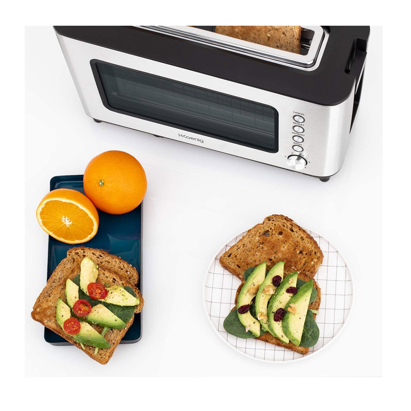 Η φρυγανιέρα, από την εταιρία H.Koenig, έχει σώμα από ανοξείδωτο ατσάλι και γυάλινο αφαιρούμενο παράθυρο για εύκολο καθαρισμό. Διαθέτει επιλογή θερμοκρασίας 6 θέσεων, για να προσαρμόσετε το ψήσιμο του ψωμιού ανάλογα με τις προτιμήσεις σας ενώ μπορείτε επίσης να ζεστάνετε ή να ξεπαγώσετε φέτες ψωμιού.
