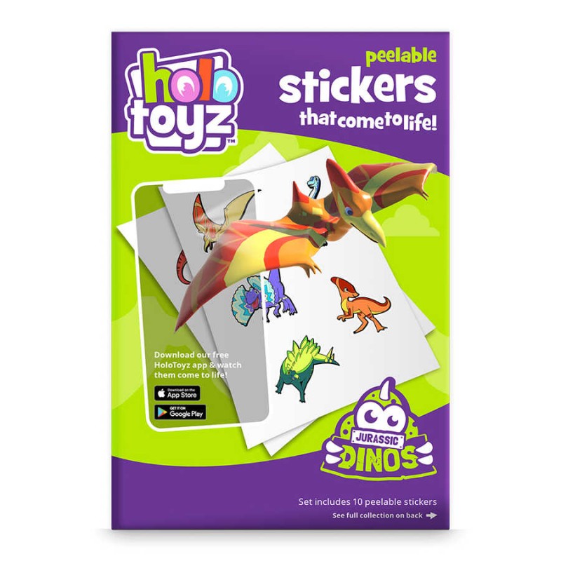 Τα αυτοκόλλητα Jurassic Dinos είναι μια παρέα πολύχρωμων,χαριτωμένων (και εδώ και εκατομμύρια χρονια εξαφανισμένων!) δεινοσαύρων που ζωντανεύουν σε κινούμενα σχέδια που κόβουν την ανάσα όταν σαρωθούν με τη δωρεάν εφαρμογή HoloToyz