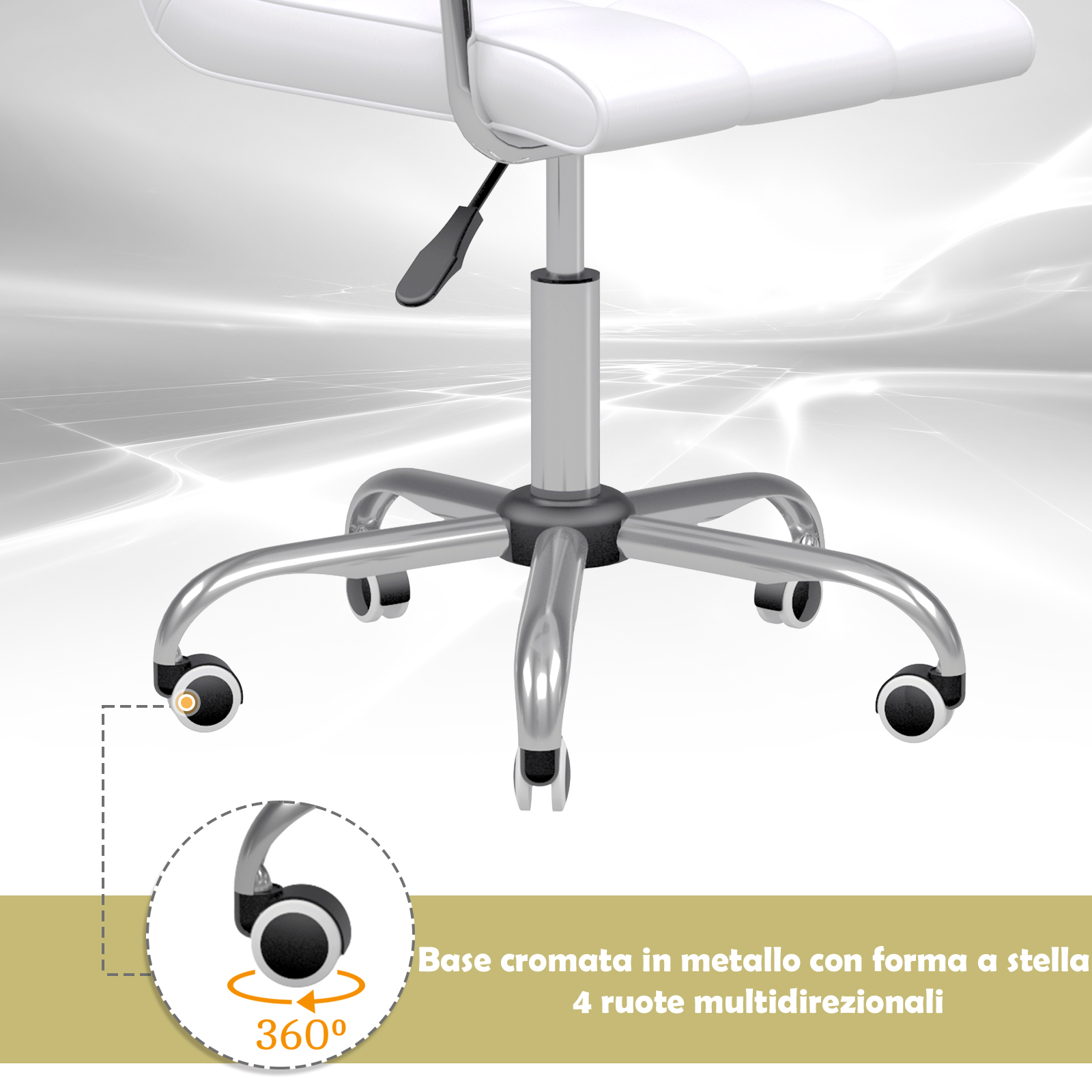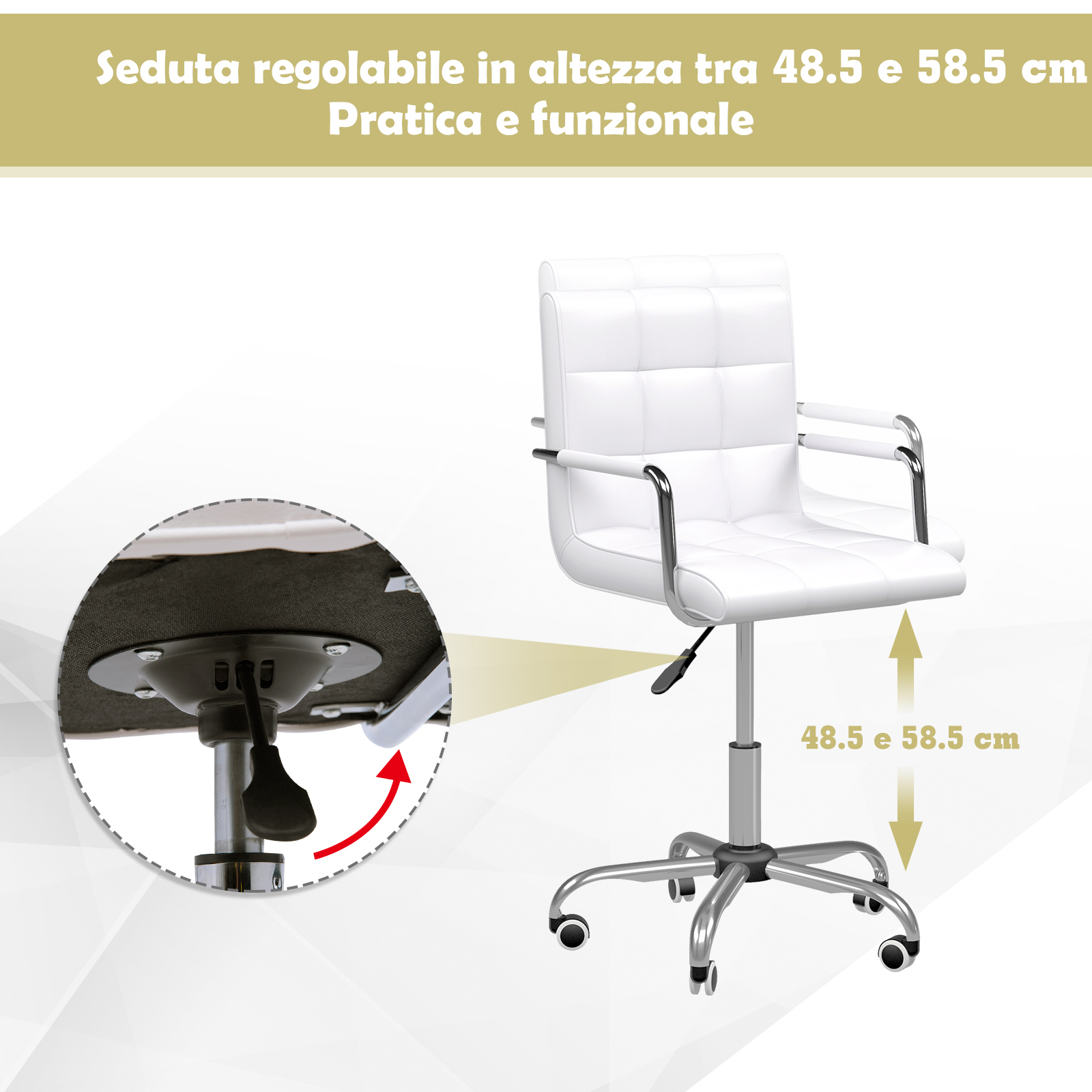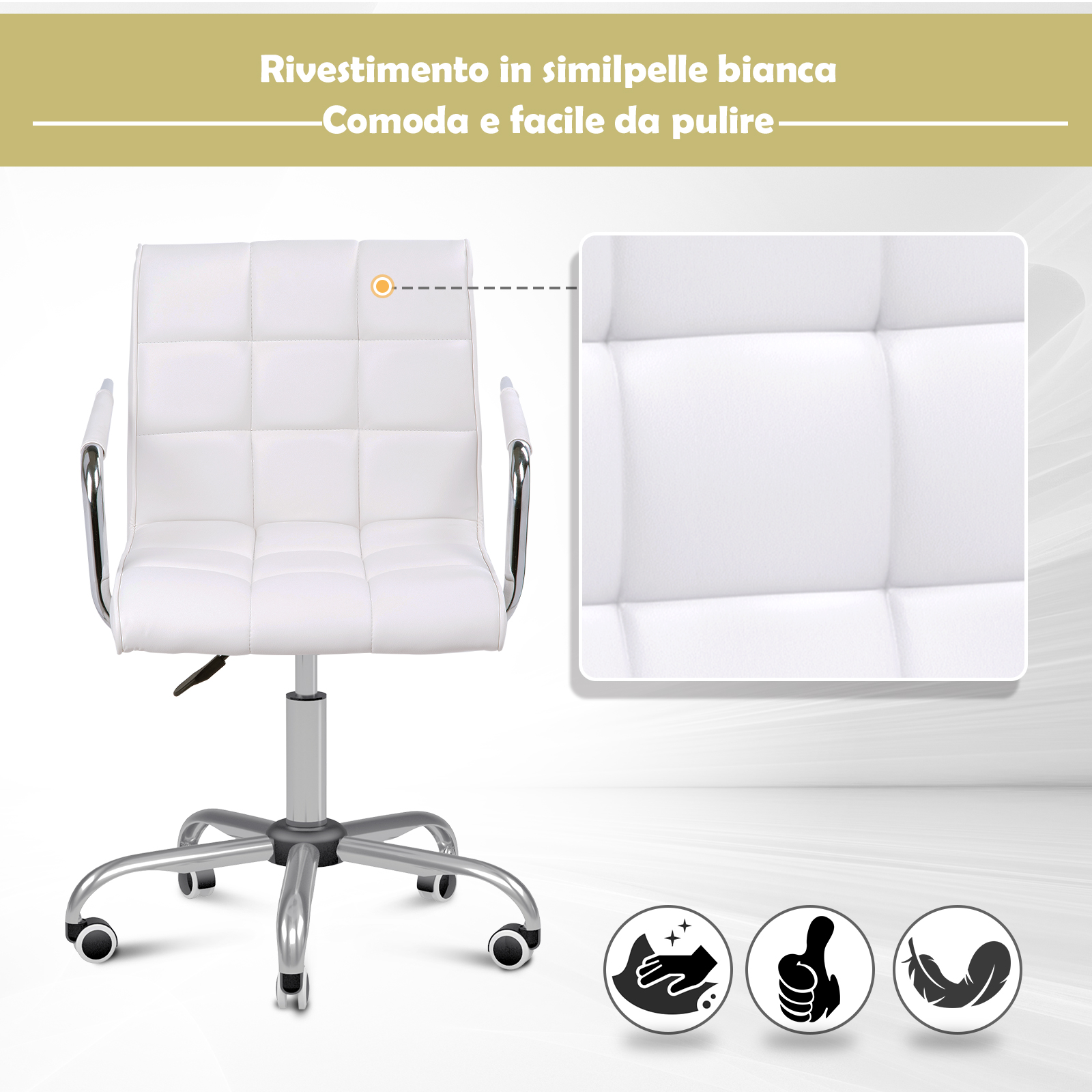 Η καρέκλα γραφείου, από την εταιρία HOMCOM, διαθέτει κάθισμα και πλάτη επενδυμένα με αφρό, για να σας προσφέρουν μέγιστη άνεση. Ο συνδυασμός της δομής από γαλβανισμένο σίδηρο και το λευκό κάλυμμα από PU δέρμα, δίνει στην καρέκλα γραφείου μια εκλεπτυσμένη εμφάνιση. Χρησιμοποιήστε το μοχλό κάτω από το κάθισμα και ρυθμίστε το ύψος μεταξύ 50-65 cm. Η βάση είναι εξοπλισμένη με 5 νάιλον τροχούς, εξαιρετικά αθόρυβους.