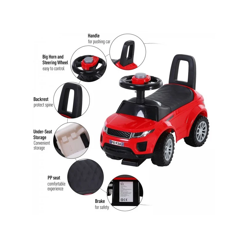 Είναι κατασκευασμένο από υψηλής ποιότητας, ασφαλή υλικά και θα ενθαρρύνει το παιδί να μάθει να ισορροπεί, να στέκεται όρθιο και να περπατάει ενώ παράλληλα παίζει και διασκεδάζει. Διαθέτει ευρύ, άνετο κάθισμα, αποθηκευτικό χώρο κάτω από αυτό και ψηλή πλάτη για να εξασφαλίσει ότι το παιδί στηρίζει σωστά τον κορμό του κατά τη διάρκεια της βόλτας. Επιπλέον έχει τιμόνι με κόρνα, τα οποία δίνουν μια πιο ρεαλιστική αίσθηση στο παιχνίδι και φρένο αντι-ανατροπής στο κάτω μέρος, το οποίο το καθιστά εξαιρετικά ασφαλές.