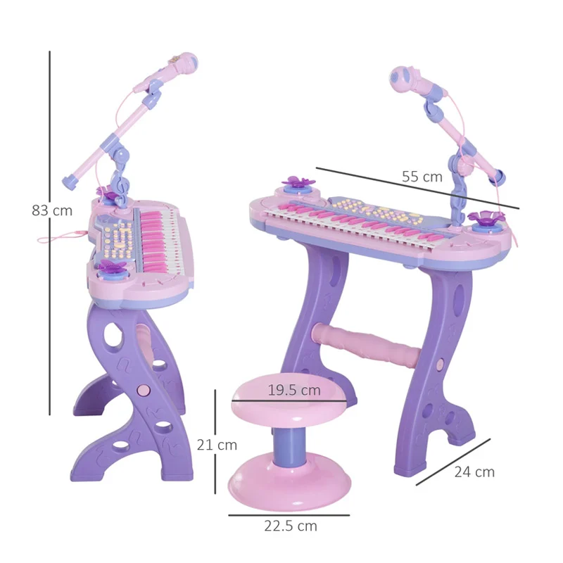 Το παιδικό πιάνο, από την εταιρία HOMCOM, διαθέτει 37 πλήκτρα και είναι εξοπλισμένο με μικρόφωνο και σκαμπό. Ένα εκπαιδευτικό παιχνίδι που διεγείρει την επιθυμία για διασκέδαση και μάθηση για τη μουσική.