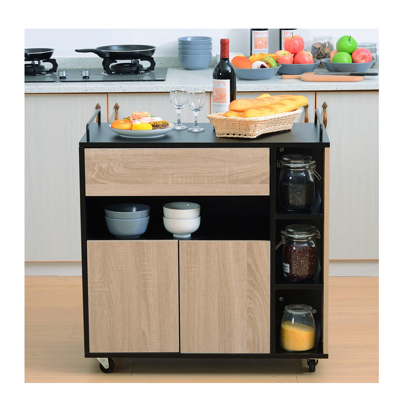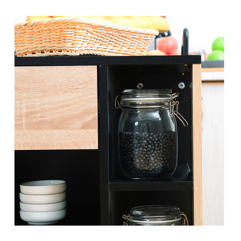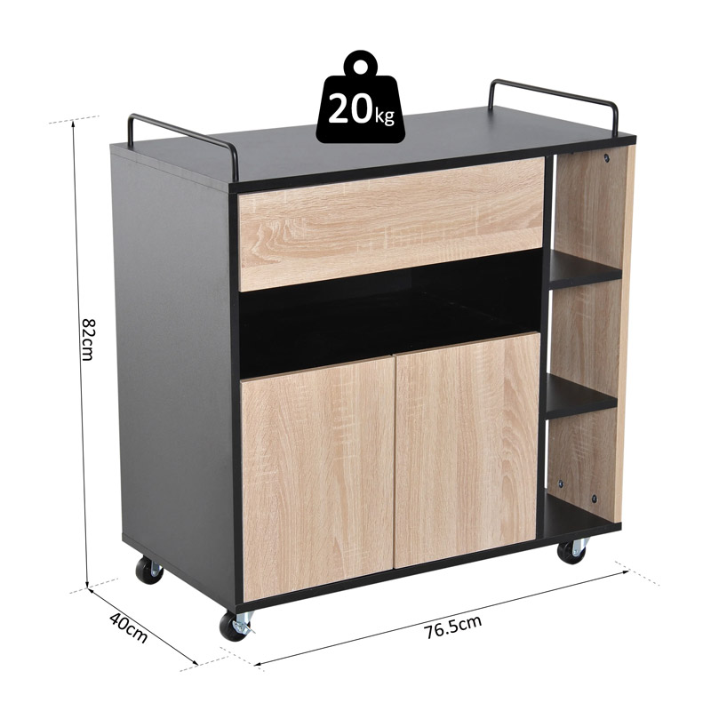Το πολυλειτουργικό ντουλάπι κουζίνας, από την εταιρία HOMCOM, είναι κατασκευασμένο από μοριοσανίδες για μακροχρόνια χρήση και εύκολη συντήρηση. Διαθέτει μεγάλο πάγκο, 1 συρτάρι, 1 διαμέρισμα, 1 ντουλάπι και 3 ράφια, προσφέροντας άφθονο χώρο για διάφορα σκεύη στην κουζίνα σας. Οι 4 περιστρεφόμενοι τροχοί (2 με φρένα) και 2 μεταλλικές λαβές που καθιστούν πολύ εύκολη τη μεταφορά του.