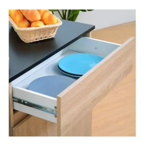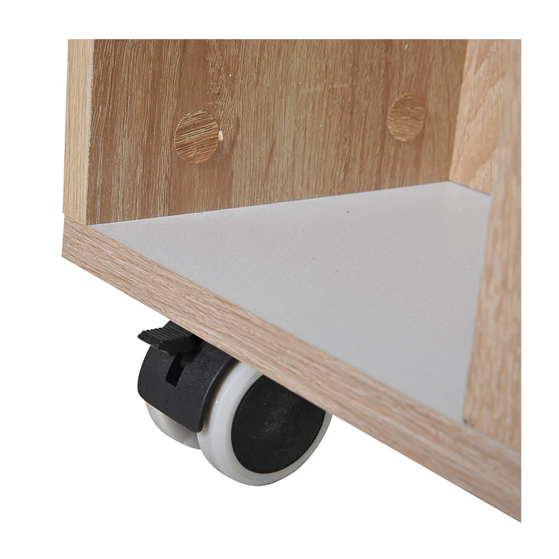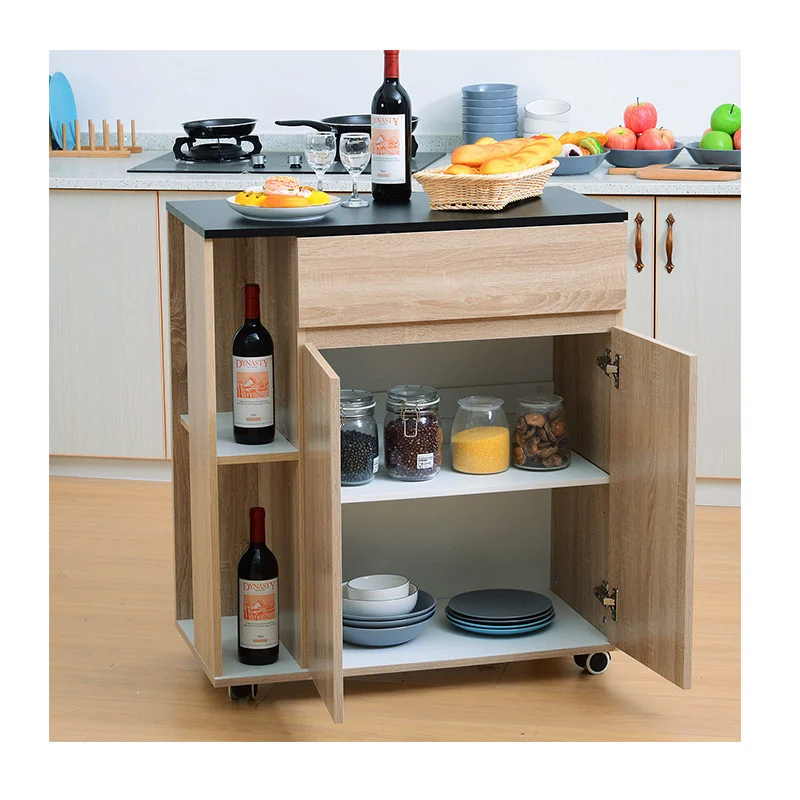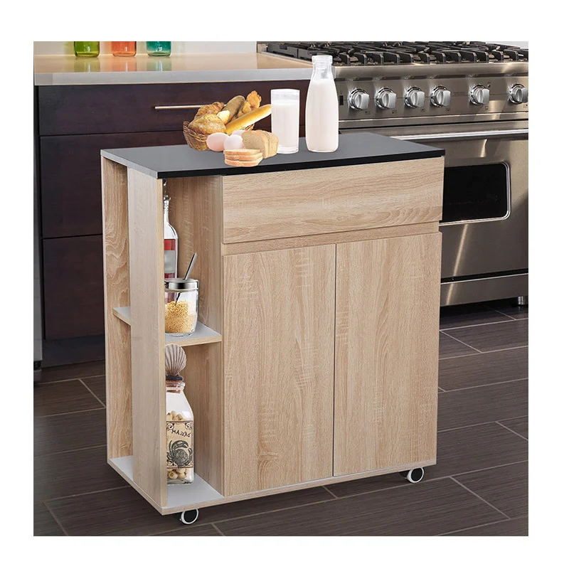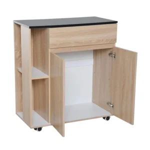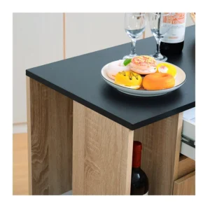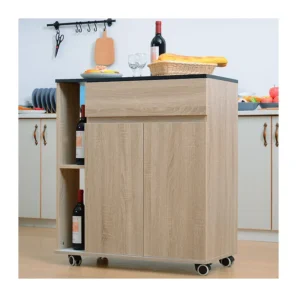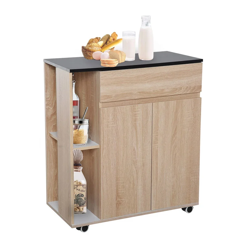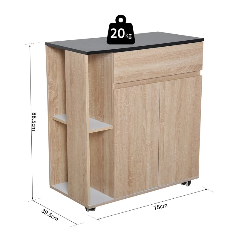 Το τρόλεϊ κουζίνας, από την εταιρία HOMCOM, είναι κατασκευασμένο από μηχανική σανίδα, για ανθεκτική χρήση και εύκολη συντήρηση. Διαθέτει μεγάλο μαύρο πάγκο, ένα συρτάρι, ένα ντουλάπι δύο επιπέδων και δύο πλαϊνά ράφια αποθήκευσης. Οι 4 τροχοί ομαλής κύλισης (2 με φρένα κλειδώματος), το καθιστούν εύκολο στη μετακίνηση.