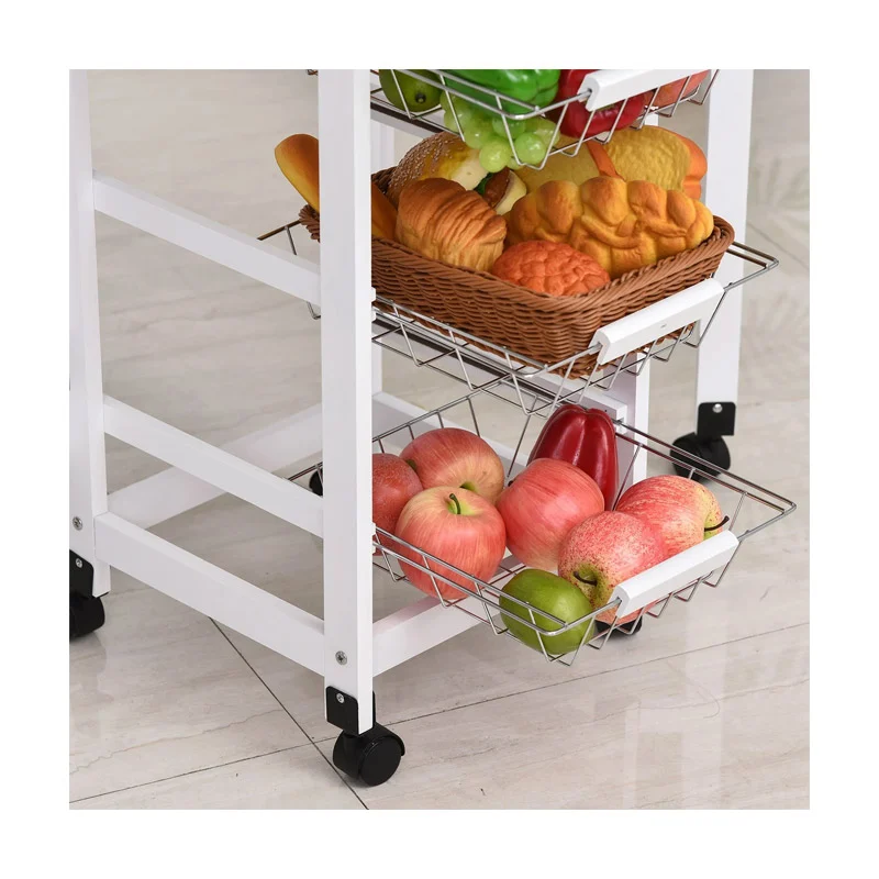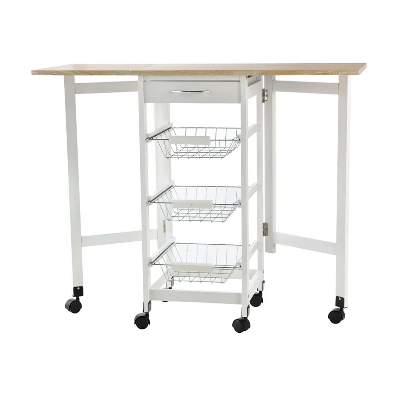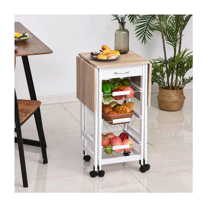 Το τρόλεϊ κουζίνας, από την εταιρία HOMCOM, αποτελεί ιδανική επιλογή για να έχετε πάντα τακτοποιημένα τα τρόφιμά σας, καθώς και διάφορα μαγειρικά σκεύη. Είναι κατασκευασμένο από ανθεκτικό ατσάλι, με επιφάνεια από MDF ξύλο και διαθέτει 3 ατσάλινα, συρόμενα καλάθια ιδανικά για την αποθήκευση φρούτων, 1 συρτάρι στο επάνω μέρος και 6 περιστρεφόμενους τροχούς, που δεν φθείρουν το δάπεδο. Η επιφάνεια του τρόλεϊ είναι επεκτεινόμενη, αριστερά και δεξιά, για να σας παρέχει επιπλέον χώρο όταν τον χρειάζεστε.
