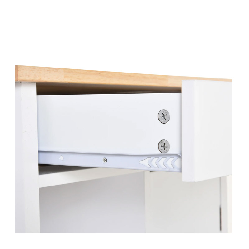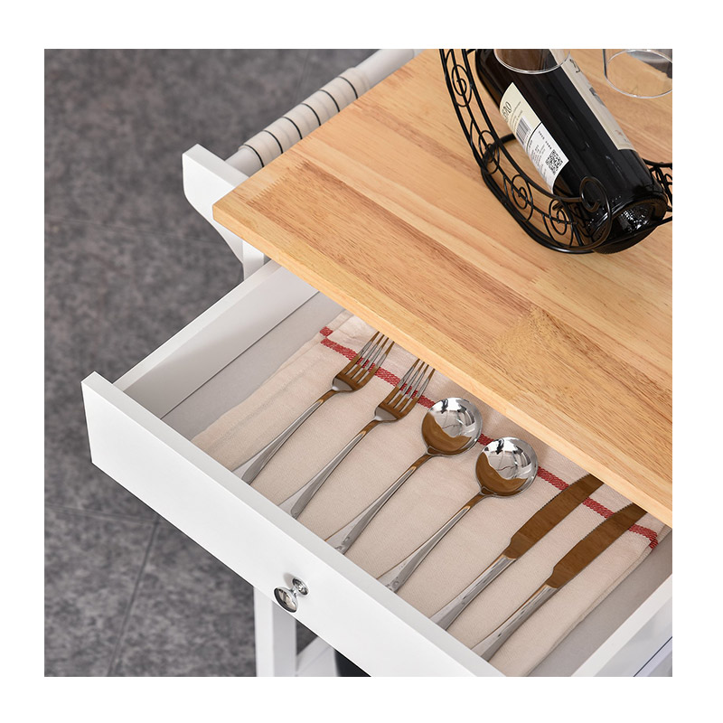 Το τρόλεϊ κουζίνας, από την εταιρία HOMCOM, είναι μια τέλεια προσθήκη στο σπίτι σας. Διαθέτει λευκό σώμα από MDF ξύλο βαθμού Ε1 με επιφάνεια από καουτσούκ φυσικού ξύλου, σχεδιασμένο για ανθεκτική μακροχρόνια χρήση. Με 1 μεγάλο συρτάρι, 1 ντουλάπι, 3 ανοιχτά ράφια, 1 ράγα πετσετών και 4 τροχούς πολλαπλών κατευθύνσεων (2 με φρένα), οι οποίοι σας επιτρέπουν να το μετακινείτε άνετα και μπορούν να κλειδωθούν όταν απαιτείται σταθερότητα.