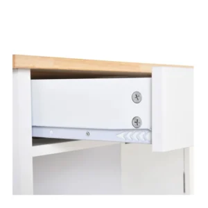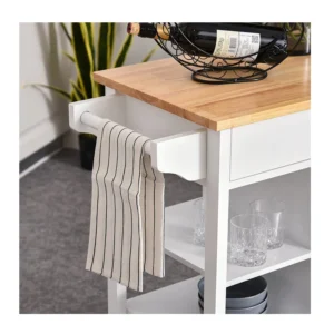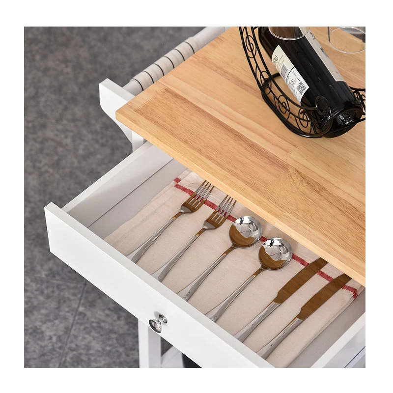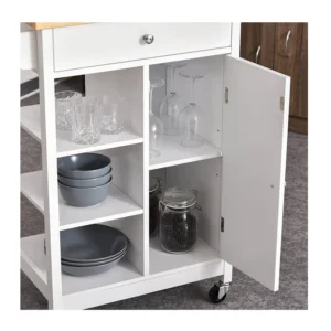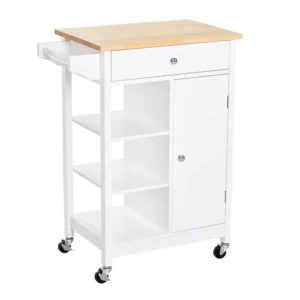Το τρόλεϊ κουζίνας, από την εταιρία HOMCOM, είναι μια τέλεια προσθήκη στο σπίτι σας. Διαθέτει λευκό σώμα από MDF ξύλο βαθμού Ε1 με επιφάνεια από καουτσούκ φυσικού ξύλου, σχεδιασμένο για ανθεκτική μακροχρόνια χρήση. Με 1 μεγάλο συρτάρι, 1 ντουλάπι, 3 ανοιχτά ράφια1 ράγα πετσετών και 4 τροχούς πολλαπλών κατευθύνσεων (2 με φρένα), οι οποίοι σας επιτρέπουν να το μετακινείτε άνετα και μπορούν να κλειδωθούν όταν απαιτείται σταθερότητα.