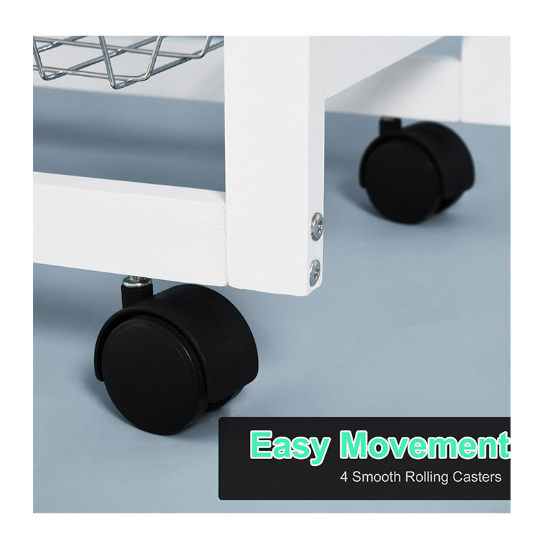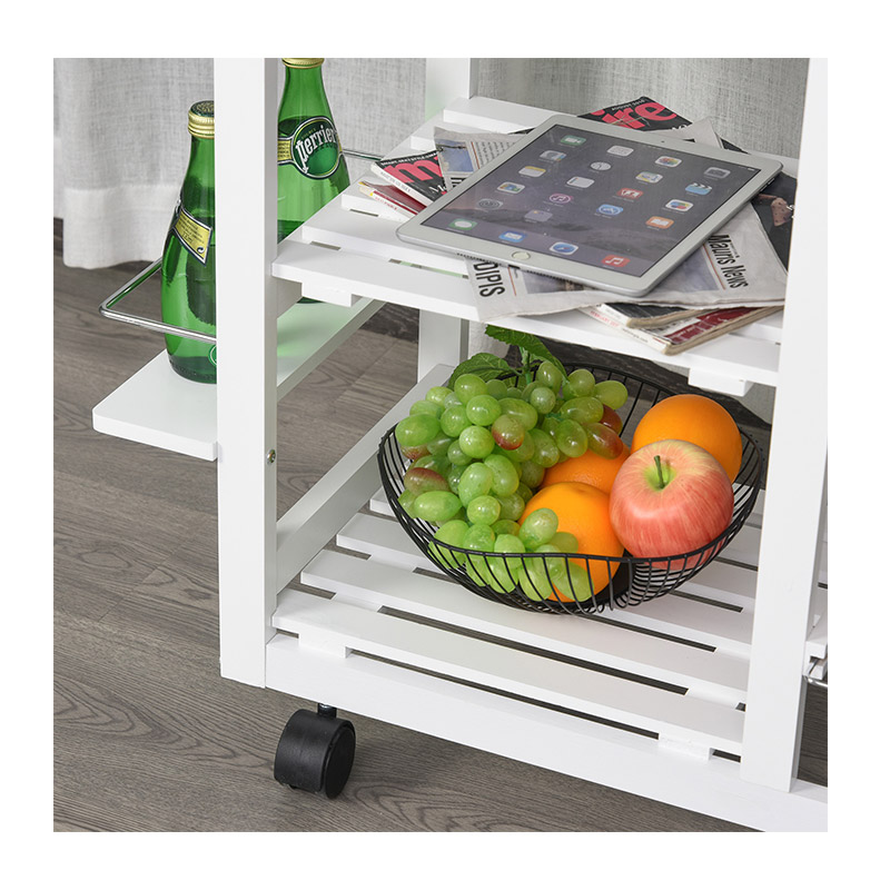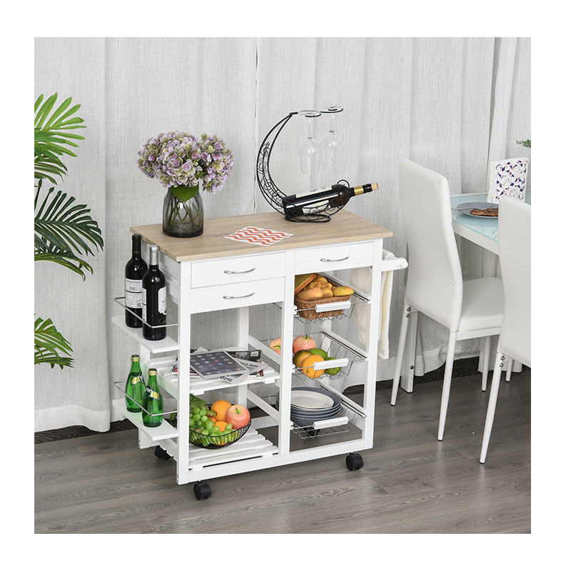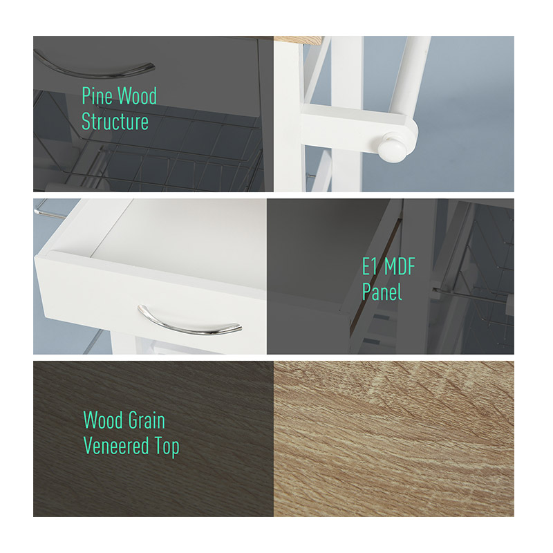 Το ξύλινο τρόλεϊ κουζίνας, από την εταιρία HOMCOM, αποτελεί ιδανική επιλογή για να έχετε πάντα τακτοποιημένα τα τρόφιμά σας, καθώς και διάφορα μαγειρικά σκεύη και πιάτα. Είναι κατασκευασμένο από ξύλο πεύκου και διαθέτει 3 ατσάλινα καλάθια ιδανικά για την αποθήκευση φρούτων, 2 πρόσθετα ράφια για την αποθήκευση μεγαλύτερων αντικειμένων, 1 λαβή στο πλάι ιδανική για πετσέτες, 3 συρτάρια στο επάνω μέρος, 2 ράφια μπαχαρικών στο πλάι και 4 περιστρεφόμενους τροχούς για γρήγορη και εύκολη κίνηση.