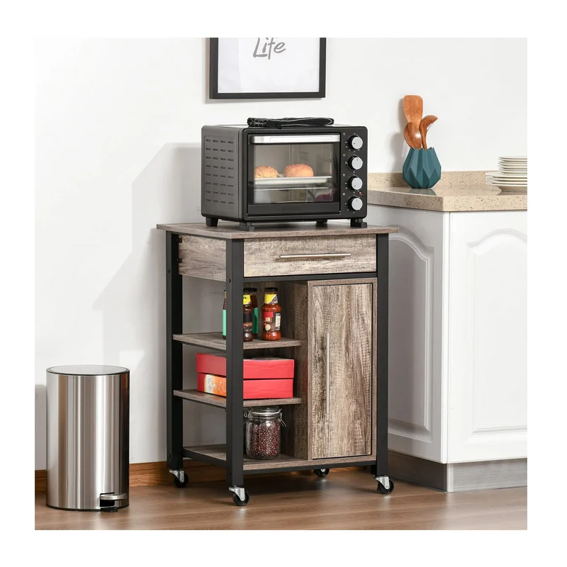 Το τρόλεϊ κουζίνας, από την εταιρία HOMCOM, αποτελεί ιδανική επιλογή για να έχετε πάντα τακτοποιημένα τα τρόφιμά σας, καθώς και διάφορα μαγειρικά σκεύη και πιάτα. Διαθέτει πλαίσιο ανθεκτικό μέταλλο και ξύλο μοριοσανίδας για υψηλή σταθερότητα, αντοχή και μακροχρόνια χρήση. Το τρόλεϊ, έχει 1 ντουλάπι αποθήκευσης με ρυθμιζόμενο εσωτερικό ράφι, 3 ανοιχτά ράφια και 1 συρτάρι. Είναι εξοπλισμένο με 4 τροχούς, 2 εκ των οποίων με φρένα για να μπορεί εύκολα να μετακινηθεί οπουδήποτε.