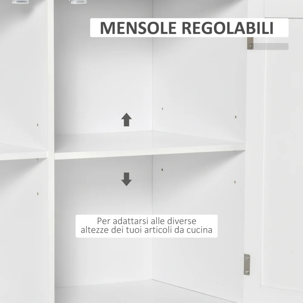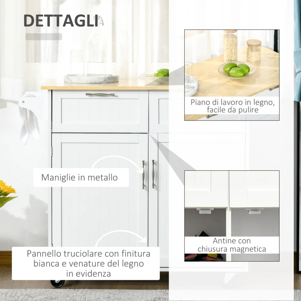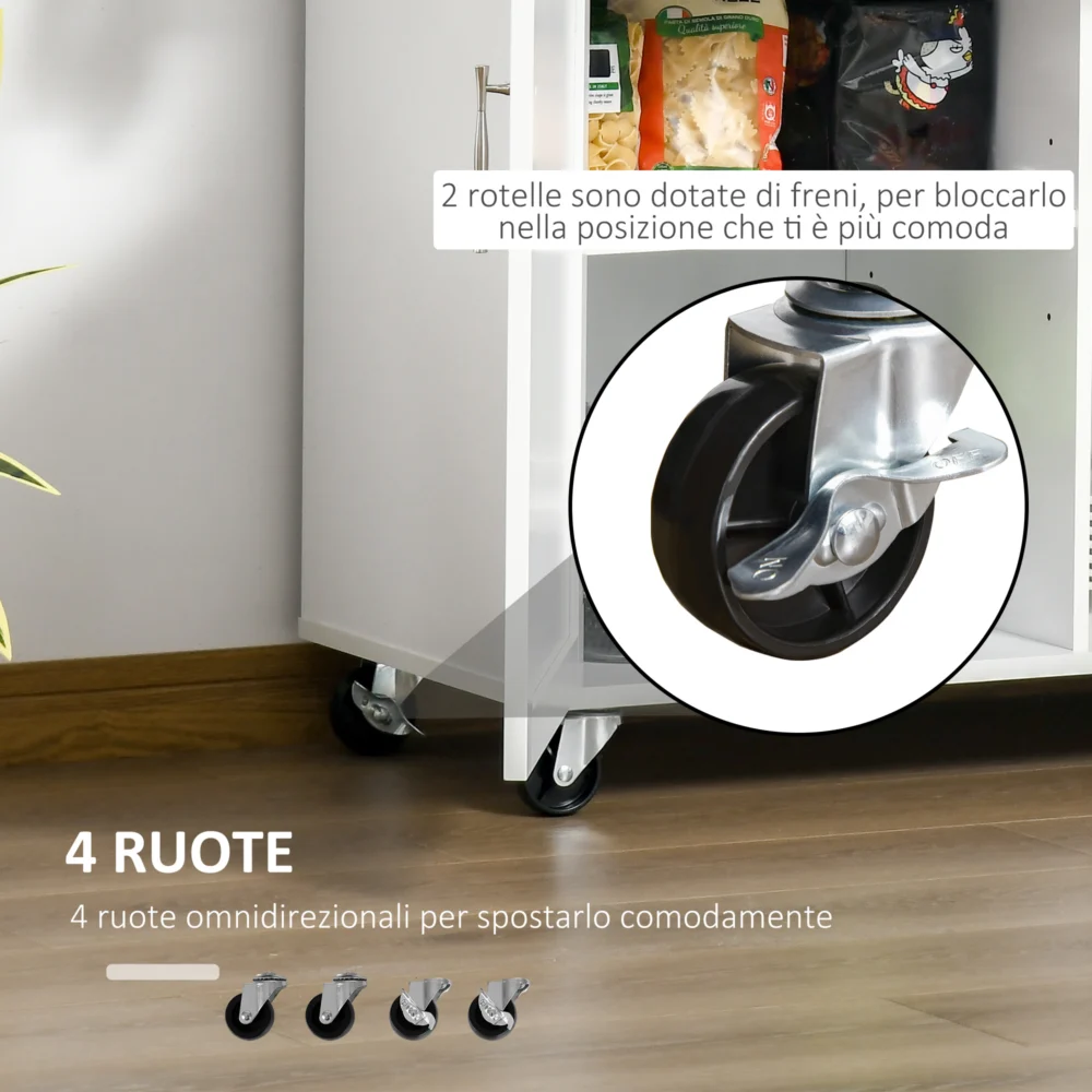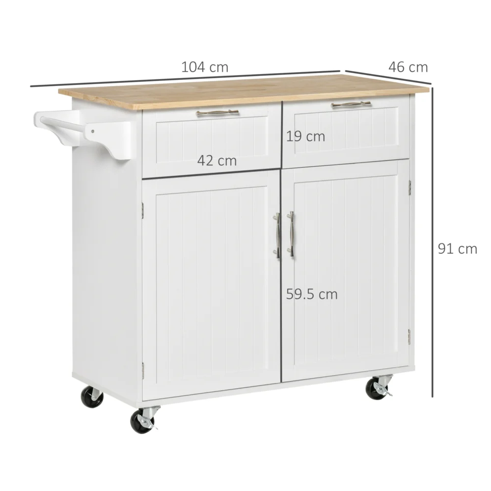 Ξύλινο καρότσι κουζίνας πολλαπλών χρήσεων HOMCOM με 2 συρτάρια, ντουλάπι και 4 ρόδες, 104x46x91cm – Λευκό 801-203