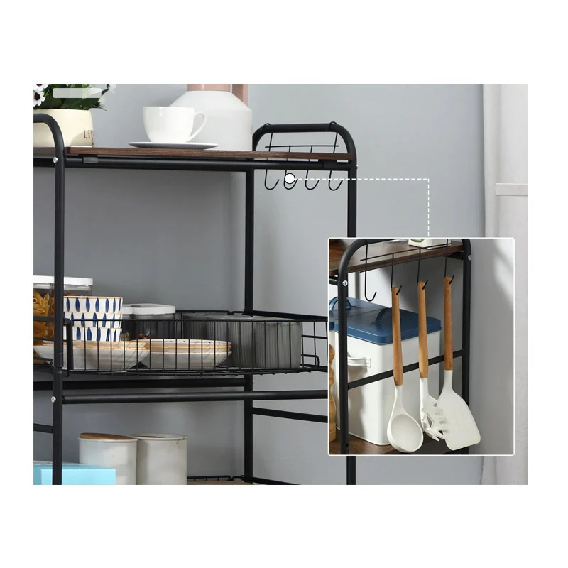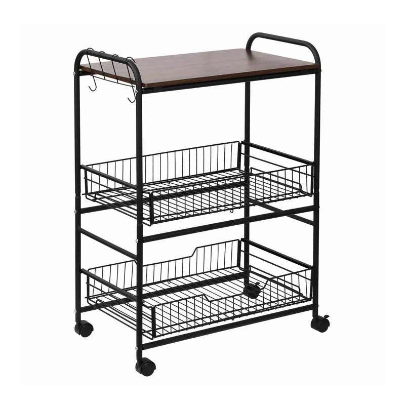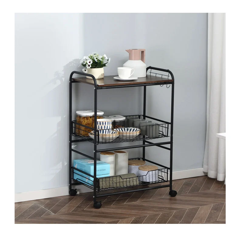 Το τρόλεϊ κουζίνας, από την εταιρία HOMCOM, αποτελεί ιδανική επιλογή για να έχετε πάντα τακτοποιημένα τα τρόφιμά σας, καθώς και διάφορα μαγειρικά σκεύη και πιάτα. Είναι κατασκευασμένο από ανθεκτικό μέταλλο και διαθέτει 1 ξύλινo ράφι, 2 μεταλλικά, συρόμενα καλάθια, ιδανικά για την αποθήκευση φρούτων, 4 πλαϊνούς γάντζους που σας επιτρέπουν να κρεμάσετε πετσέτες ή μαγειρικά σκεύη και 4 περιστρεφόμενους τροχούς (οι 2 με φρένα) για γρήγορη και εύκολη κίνηση.