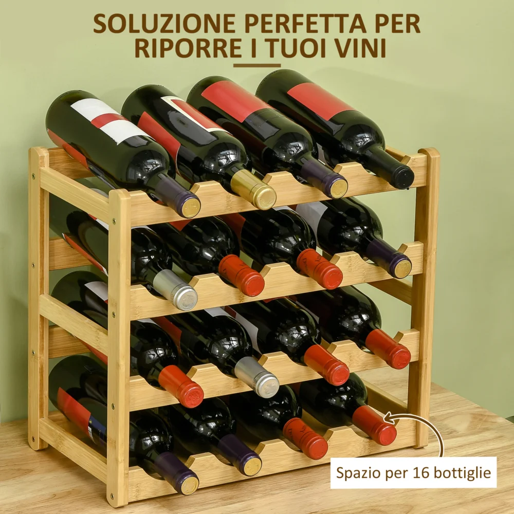 Η ραφιέρα κρασιών, από την εταιρία HOMCOM, είναι κατασκευασμένη από ξύλο μπαμπού με βερνίκι, ανθκετική στο νερό και τις γρατζουνιές. Διαθέτει 4 ράφια για 16 μπουκάλια των 750 ml και μπορεί να αντέξει βάρος έως 75 Kg. Έχει απλή συναρμολόγηση και εύκολο καθαρισμό με υγρό πανί.