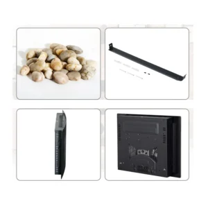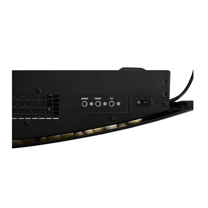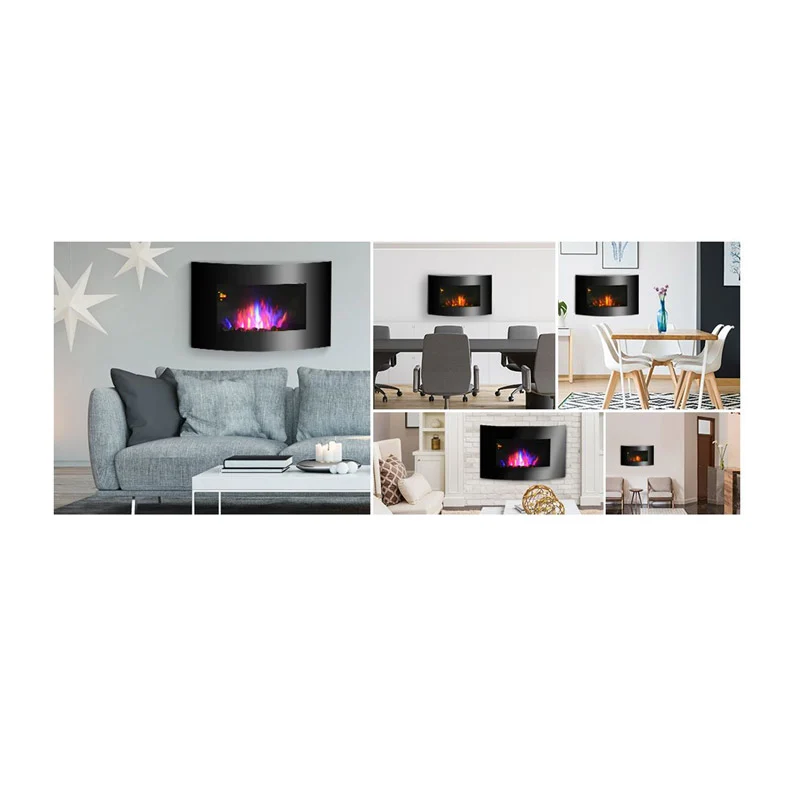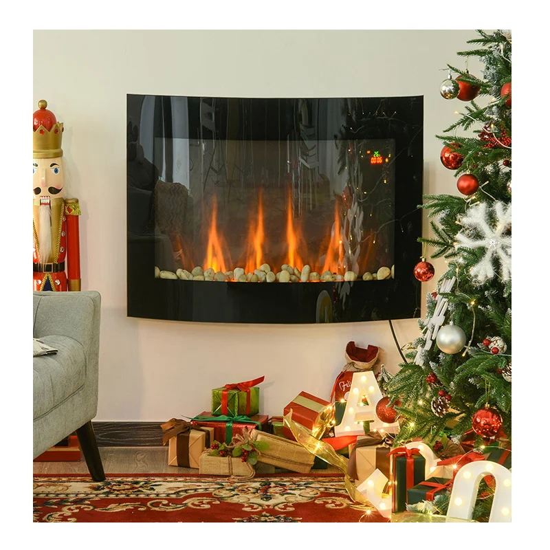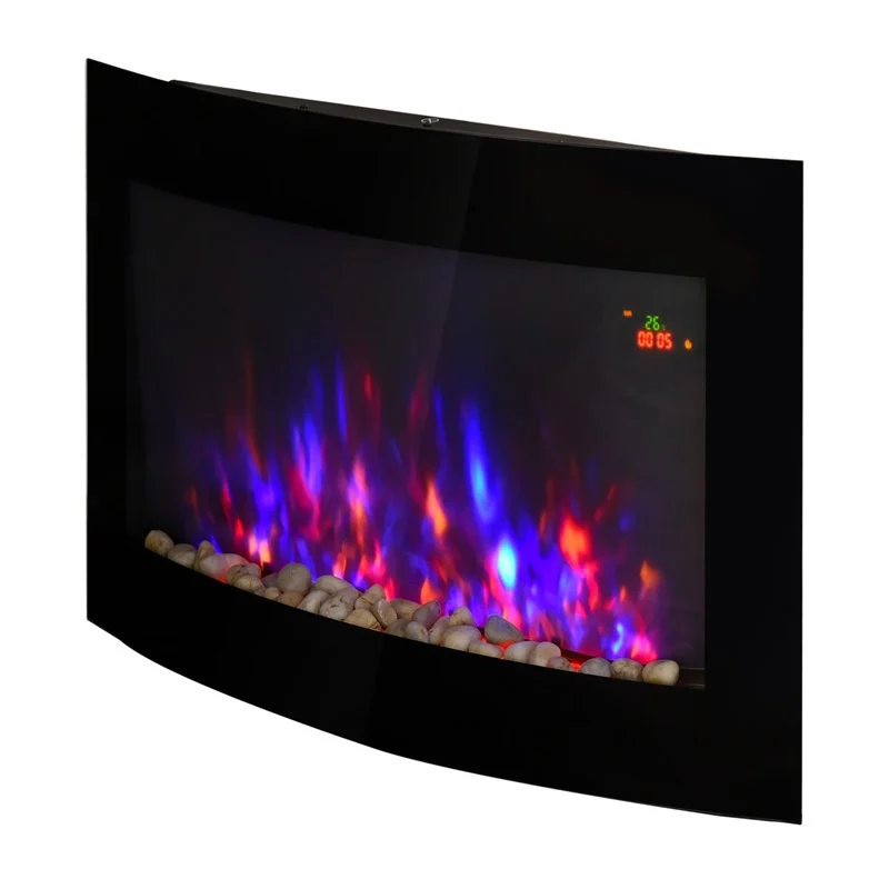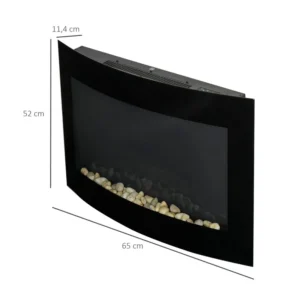 Το ηλεκτρικό τζάκι τοίχου, από την εταιρία HOMCOM, διαθέτει καμπυλωτή σχεδίαση με μαύρο γυαλί, δίνοντας μεγαλύτερη γωνία θέασης. Με 2 ρυθμίσεις θερμότητας, και οθόνη εφέ φλόγας με 7 επιλογές LED χρώματος πλαισίου. Είναι εξοπλισμένο με τηλεχειριστήριο που διευκολύνει τόσο την εκκίνηση και τον τερματισμό, όσο και τον έλεγχο κατά τη λειτουργία και προγραμματιζόμενο χρονοδιακόπτη.