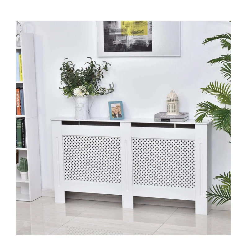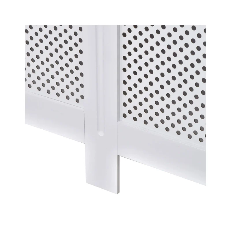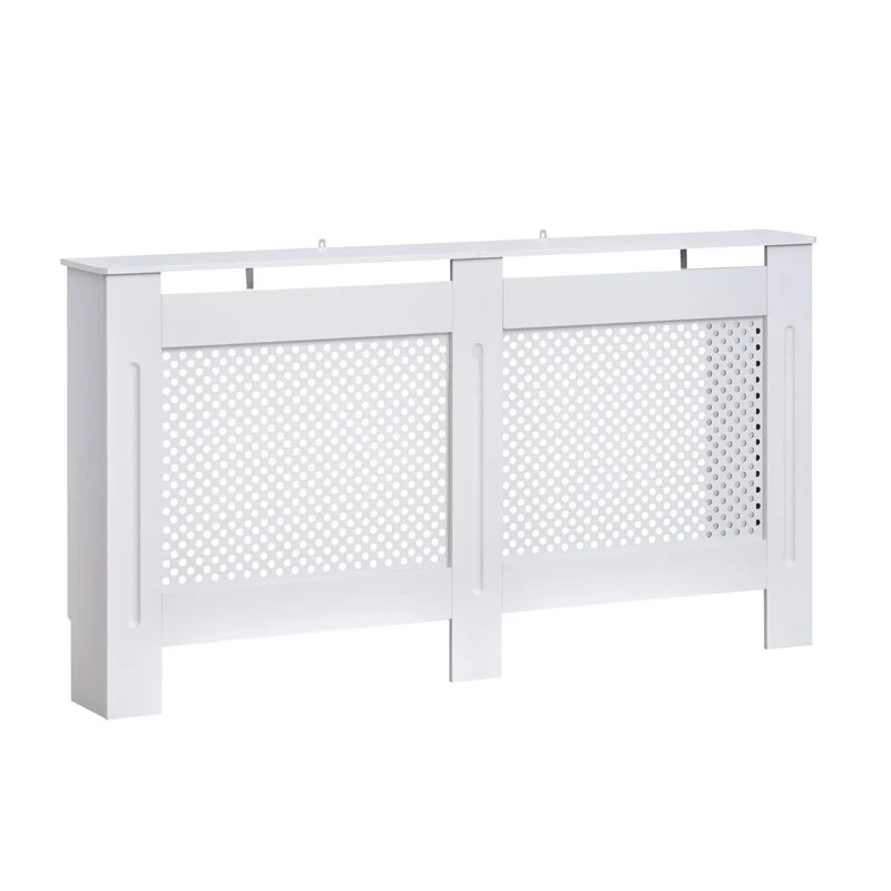 Το κάλυμμα καλοριφέρ, από την εταιρία HOMCOM, είναι κατασκευασμένο από MDF με σχάρα σε σχήμα διαμαντιού, σε λευκό ουδέτερο χρώμα. Έχει μπροστινό σχεδιασμό ώστε να επιτρέπει τη διάχυση της θερμότητας από το καλοριφέρ στον χώρο, ενώ το πάνω ράφι προσφέρει τη δυνατότητα τοποθέτησης διάφορων διακοσμητικών αντικειμένων.