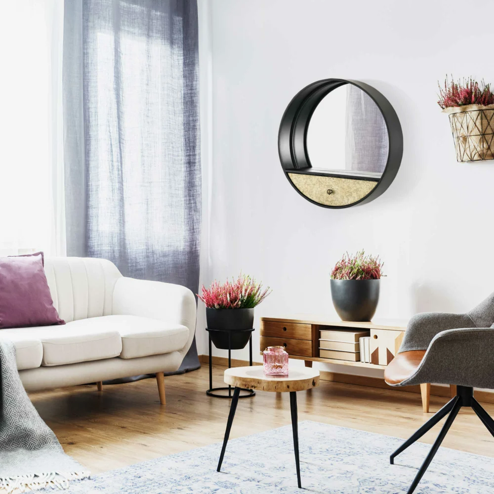 HOMCOM Στρογγυλός Καθρέφτης Τοίχου Ø61cm με Συρτάρι και Μαύρο Μεταλλικό Σκελετό 830-474