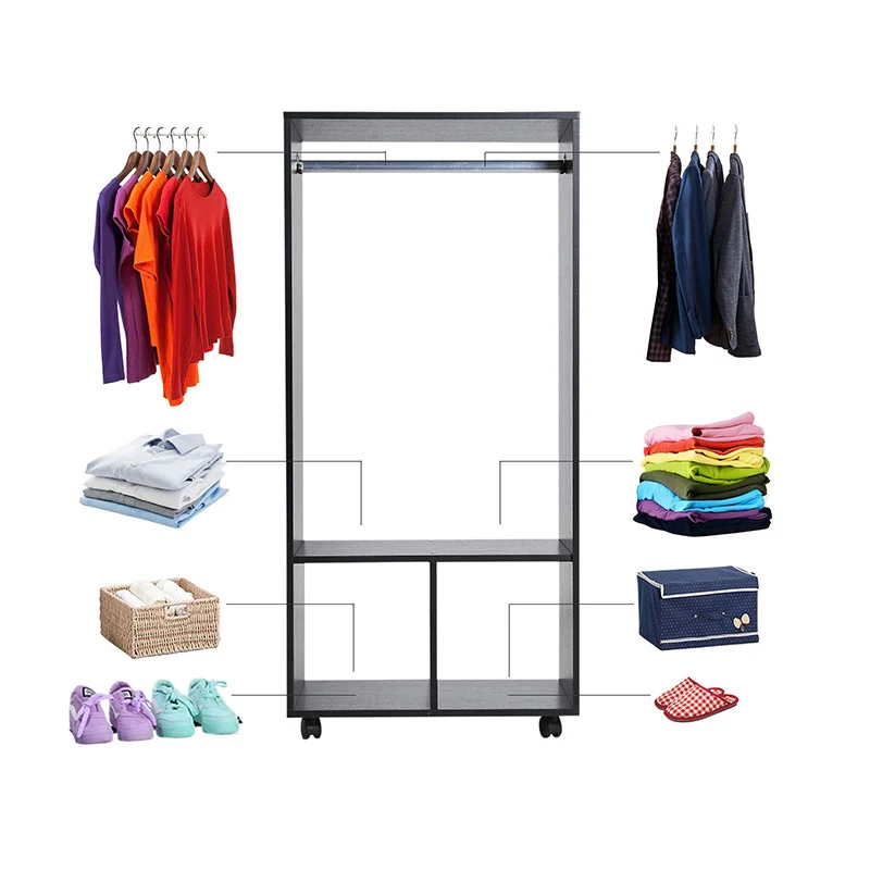 Η ντουλάπα, από την εταιρία HOMCOM, είναι κατασκευασμένη από υψηλής ποιότητας μοριοσανίδες με μελαμίνη και φινίρισμα με κόκκους ξύλου για όμορφη εμφάνιση. Αποτελείται από δύο ανοιχτά ράφια στο κάτω μέρος και μία ράγα αλουμινίου για ρούχα σε κρεμάστρες, καθιστώντας την ιδανική λύση για να οργανώσετε καλύτερα τα πράγματα σας. Οι τέσσερις τροχοί σας δίνουν τη δυνατότητα να μετακινήσετε την ντουλάπα με ευκολία στο σημείο που θέλετε.