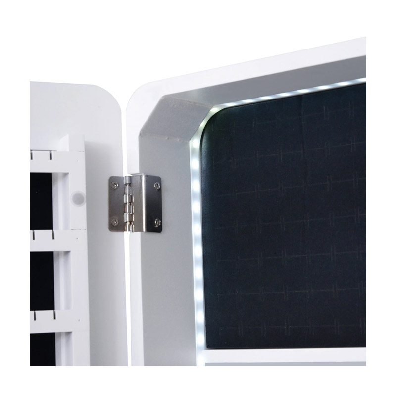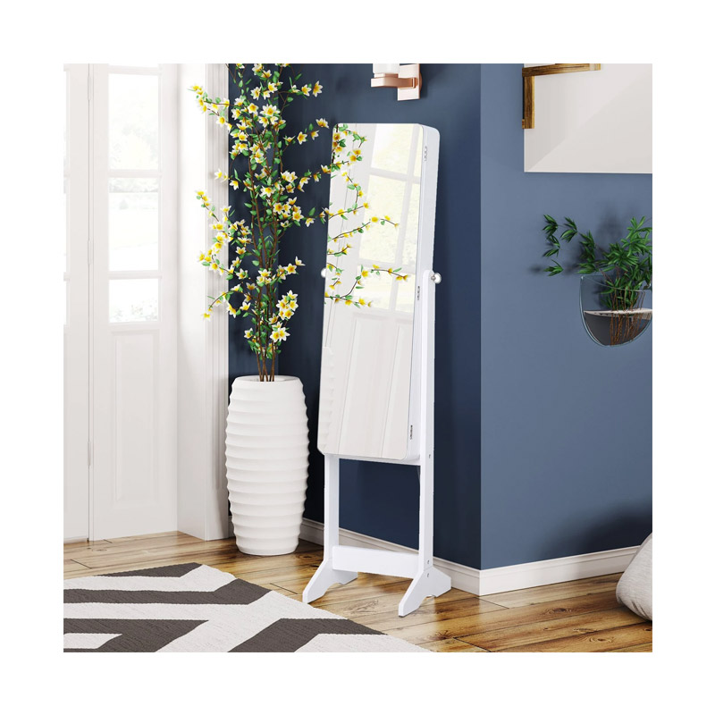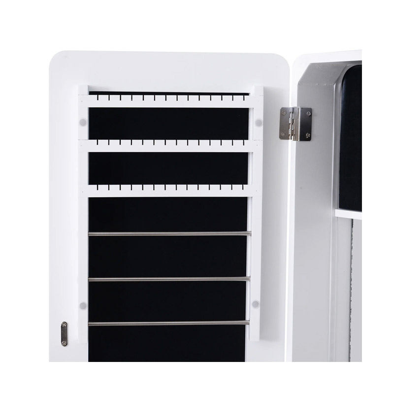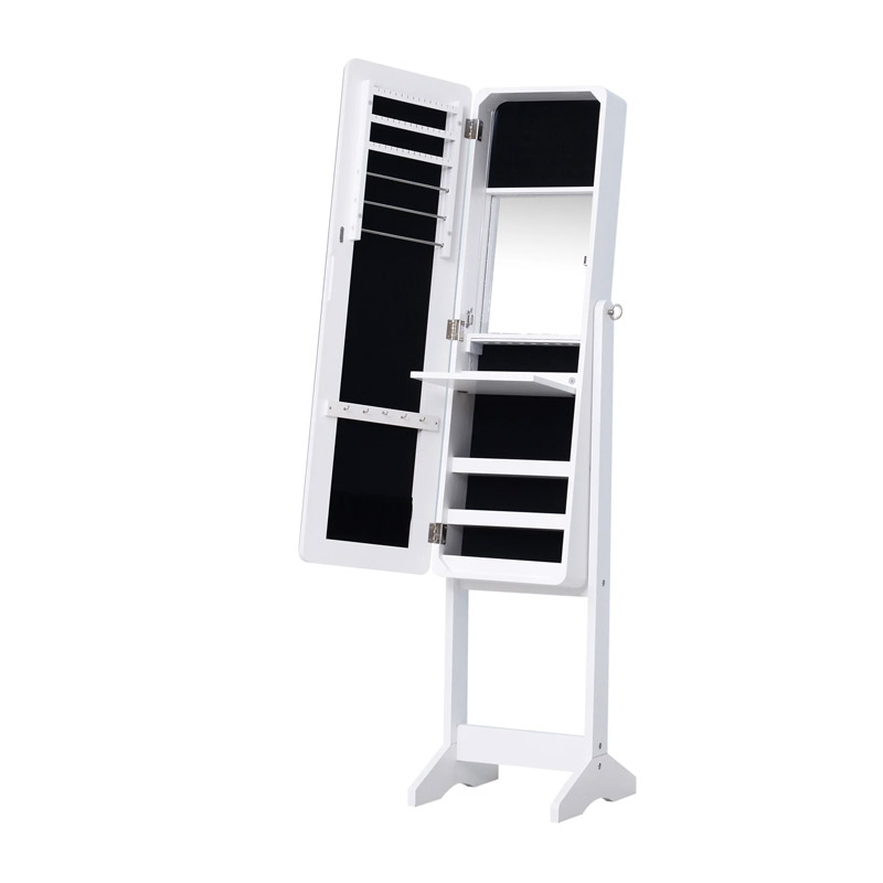 Η κοσμηματοθήκη από την εταιρεία HOMCOM, είναι κατασκευασμένη από MDF ξύλο με εσωτερική βελούδινη επένδυση και σας προσφέρει άφθονο αποθηκευτικό χώρο για τα κοσμήματά σας. Διαθέτει 3 ράφια στο κάτω μέρος, 3 σειρές υποδοχών για σκουλαρίκια, 5 άγκιστρα για κολιέ, 3 ράγες για κασκόλ, 1 θήκη, 1 υποδοχή για δακτυλίδια, 9 υποδοχές πινέλων και 1 πτυσσόμενο ράφι. Επιπλέον, ο ολόσωμος καθρέπτης στο εξωτερικό της, σας δίνει την δυνατότητα να κάνετε εύκολα το μακιγιάζ σας ή να φορέσετε τα κοσμήματα σας και ο εσωτερικός LED φωτισμός, την καθιστά πρακτική και λειτουργική ακόμη και στο σκοτάδι.