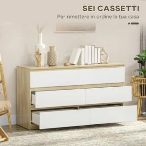 Συρταριέρα HOMCOM Μοντέρνα Ξύλινη Συρταριέρα 6 Συρτάρια, 135x48x77cm, Λευκό και Χρώμα ξύλου 831-636V00WT