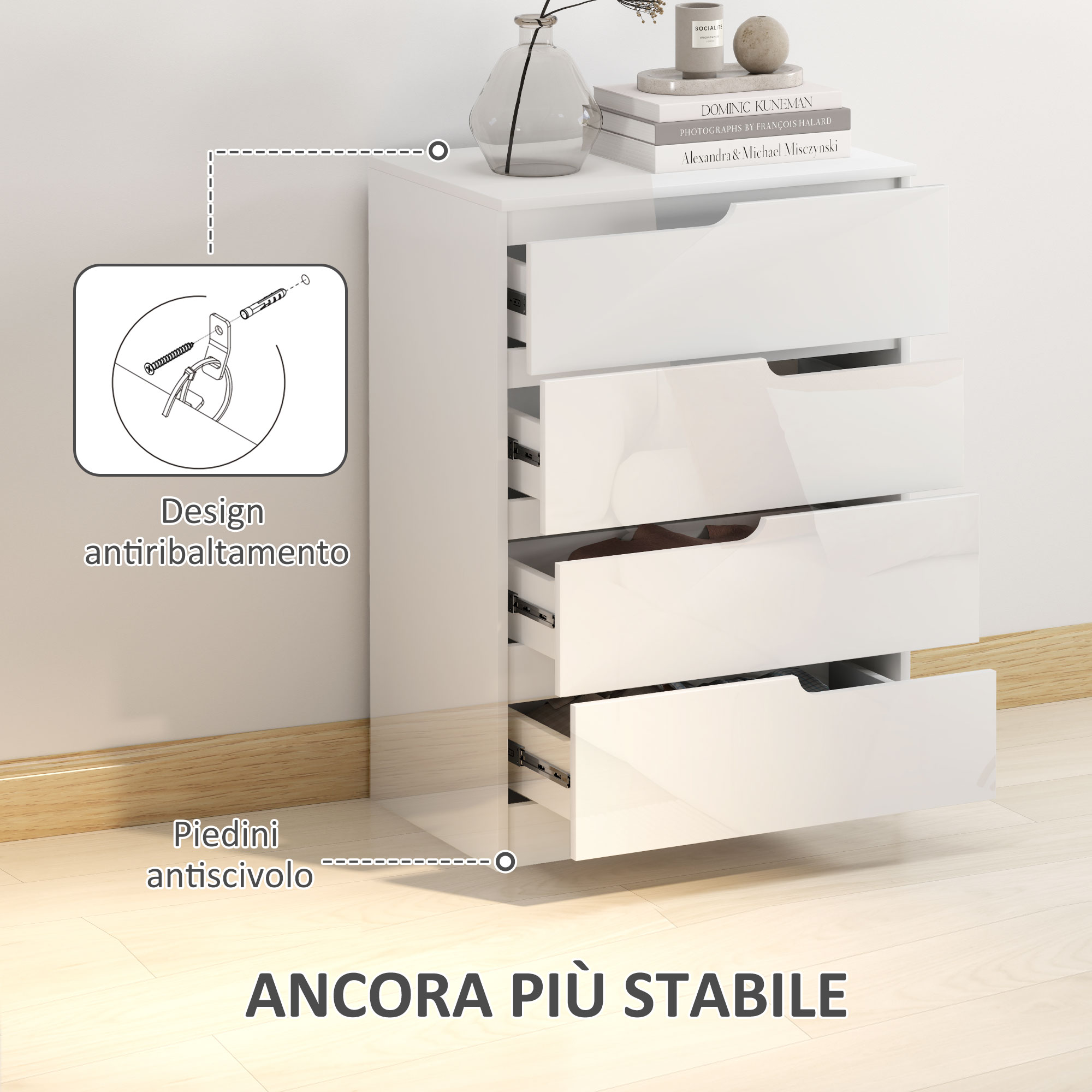 HOMCOM Συρταριέρα 4 Συρταριών Μοντέρνα και Μινιμαλιστική σε Ξύλο, 60x40x85 εκ., Λευκή Γυαλιστερή 831-905V01WT