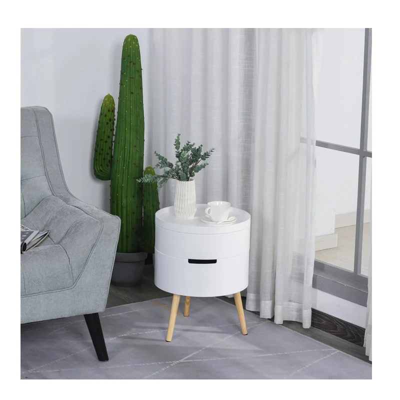 Το βοηθητικό τραπεζάκι, από την εταιρία HOMCOM, είναι κατασκευασμένο από ξύλο MDF και έχει πόδια από συμπαγές ξύλο πεύκου. Διαθέτει περιστρεφόμενο άνοιγμα και 2 εσωτερικούς, αποθηκευτικούς χώρους. Η κορυφή του τραπεζιού είναι αποσπώμενη, με υπερυψωμένα άκρα και μπορεί να μετατραπεί εύκολα σε δίσκο .