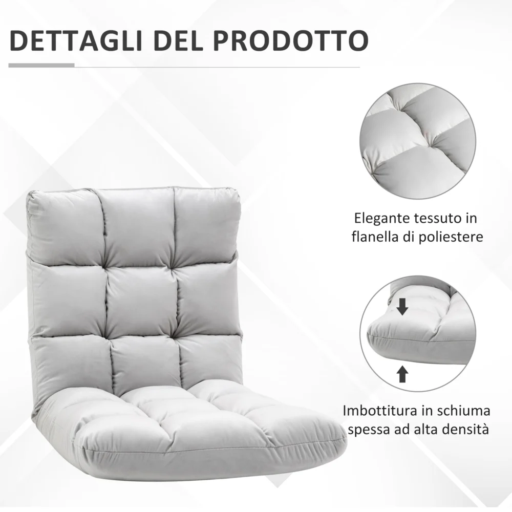 Η πολυθρόνα δαπέδου, από την εταιρία HOMCOM, διαθέτει παχιά επένδυση και μαλακό φανελένιο κάλυμμα, που την καθιστούν εξαιρετικά άνετο. Η πλάτη μπορεί να ανακληθεί έως και 180°, ώστε να μπορείτε να επιλέξετε το επίπεδο άνεσης που προτιμάτε. Ο απλός σχεδιασμός και το ουδέτερο χρώμα του φινιρίσματος κάνουν την πολυθρόνα ιδανική για κάθε χώρο.