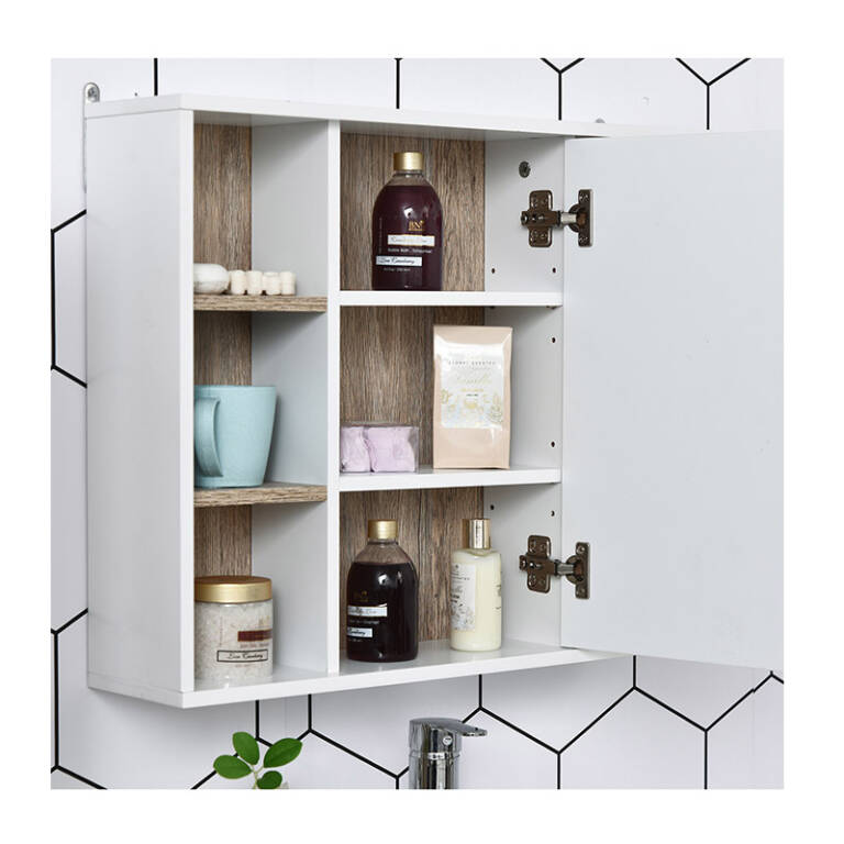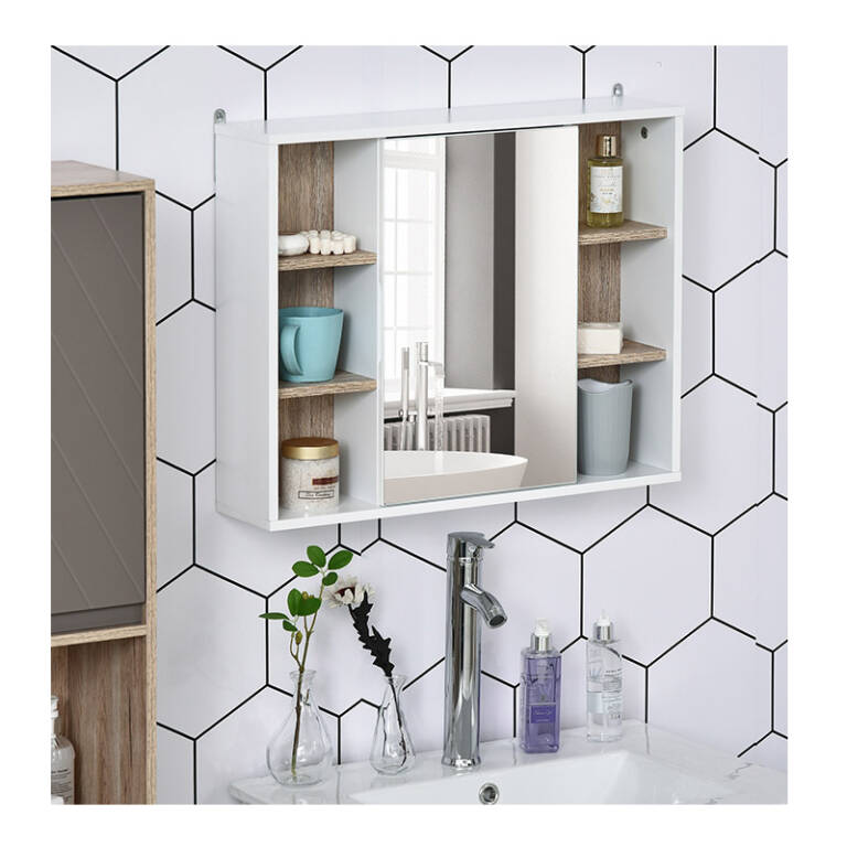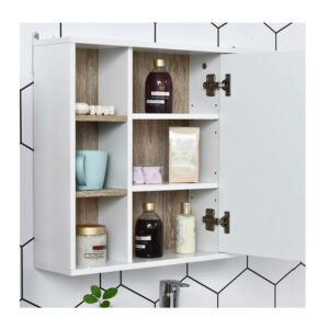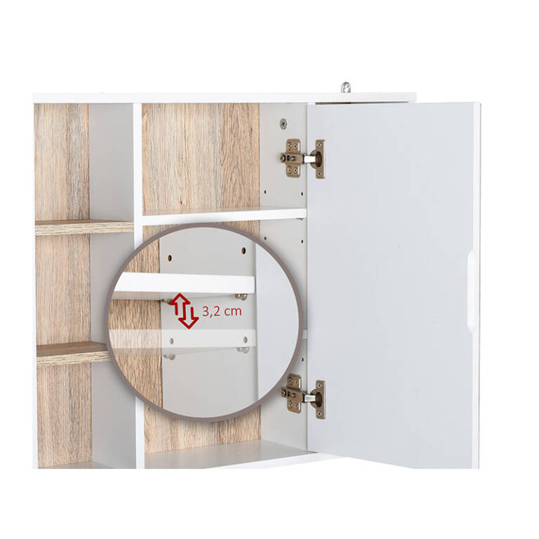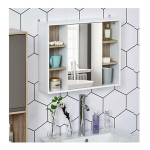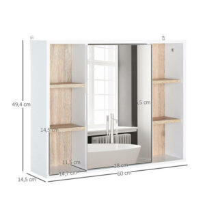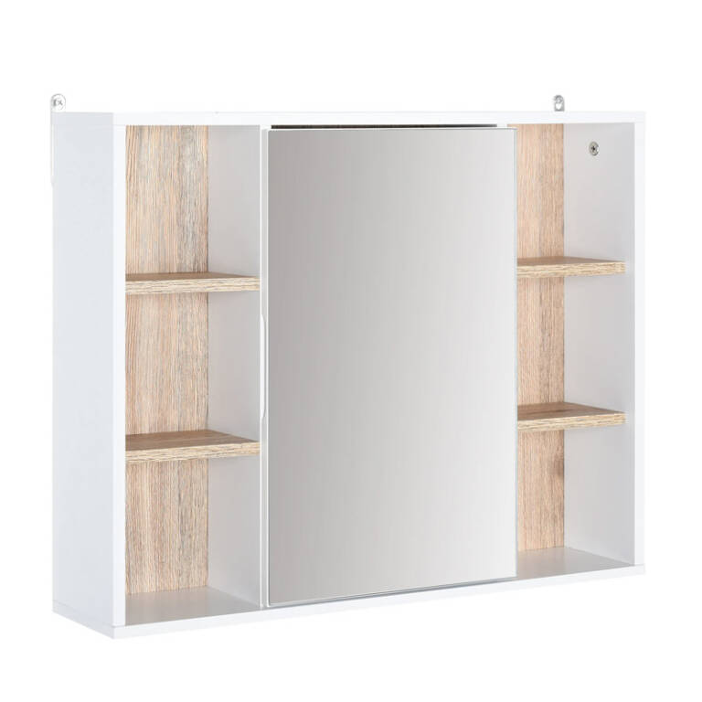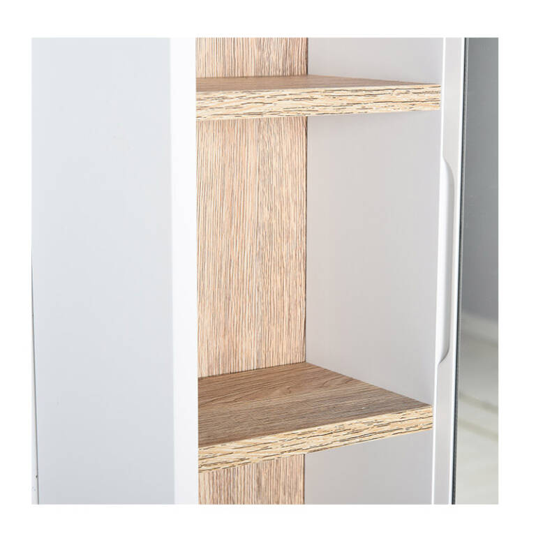 Ο καθρέπτης – ντουλάπι, από την εταιρία HOMCOM, είναι κατασκευασμένος από ανθεκτικό MDF για υψηλή σταθερότητα. Διαθέτει ντουλάπι με τρία ράφια (τα δύο ρυθμιζόμενα σε ύψος τριών θέσεων), καθώς και τρία ανοιχτά ράφια και στις δύο πλευρές.