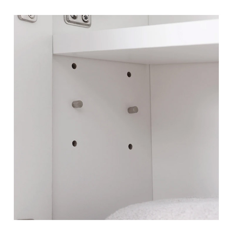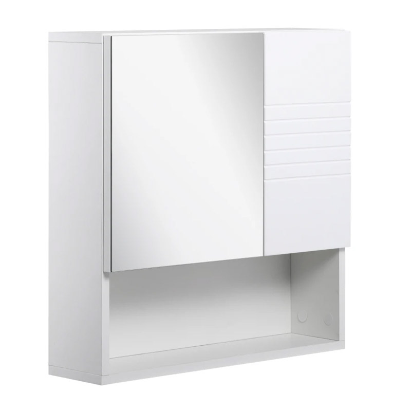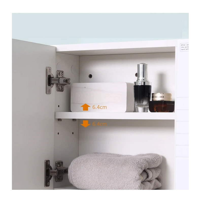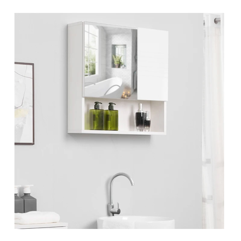 Το ντουλάπι, από την εταιρία Kleankin, είναι κατασκευασμένο από υψηλής ποιότητας MDF ξύλο, ανθεκτικό και με εύκολο καθαρισμό. Διαθέτει δύο πόρτεςη μία με καθρέπτη – και στο εσωτερικό έχει ράφι ρυθμιζόμενο σε 3 ύψη. Στο κάτω μέρος, διαθέτει ένα επιπλέον ανοιχτό ράφι.