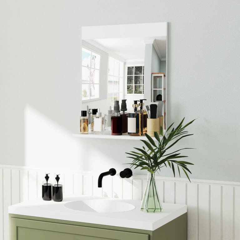 • Το ράφι αποθήκευσης του καθρέφτη τοίχου οργανώνει αποτελεσματικά τα προϊόντα μπάνιου.